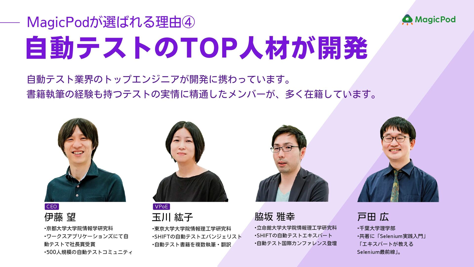 自動テストのTOP人材が開発 自動テスト業界のトップエンジニアが開発に携わっています。 書籍執筆の経験も持つテストの実情に精通したメンバーが、多く在籍しています。 MagicPodが選ばれる理由④ •立命館大学大学院情報理工学研究科 •SHIFTの自動テストエキスパート •自動テスト国際カンファレンス登壇 脇坂 雅幸 •千葉大学理学部