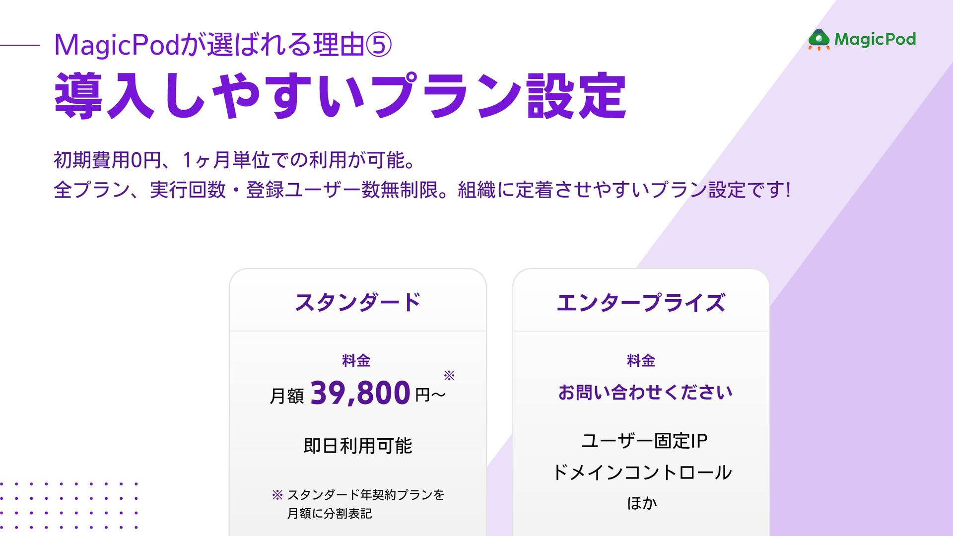 導入しやすいプラン設定 初期費用0円、1ヶ月単位での利用が可能。 全プラン、実行回数・登録ユーザー数無制限。組織に定着させやすいプラン設定です! MagicPodが選ばれる理由⑤ スタンダード 即日利用可能 39,800円〜 月額 お問い合わせください ※