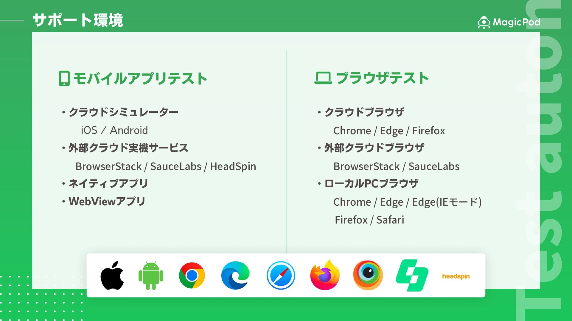 BrowserStack / SauceLabs / HeadSpin ・ネイティブアプリ ・WebViewアプリ モバイルアプリテスト ・クラウドブラウザ Chrome / Edge / Firefox ・外部クラウドブラウザ BrowserStack / SauceLabs ・ローカルPCブラウザ Chrome / Edge / Edge(IEモード) Firefox / Safari ブラウザテスト