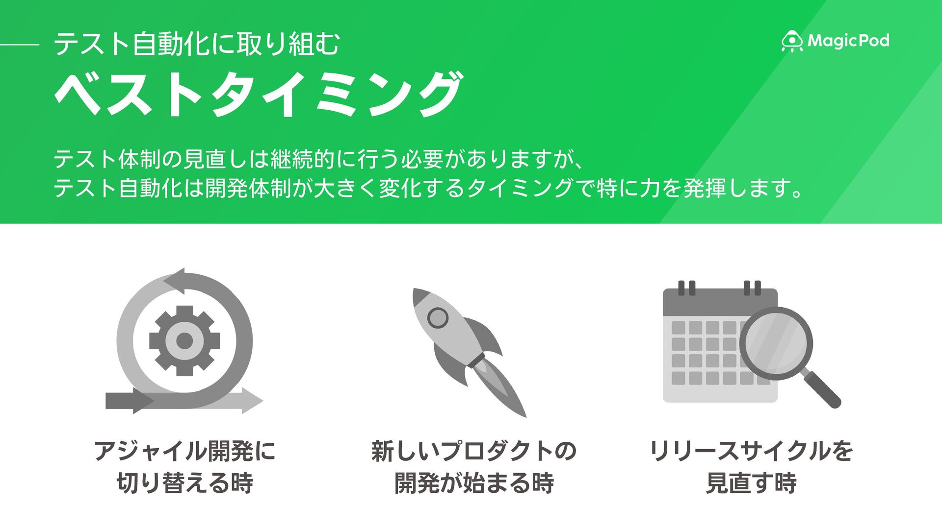 リリースサイクルを 見直す時 アジャイル開発に 切り替える時 新しいプロダクトの 開発が始まる時 ベストタイミング テスト体制の見直しは継続的に行う必要がありますが、 テスト自動化は開発体制が大きく変化するタイミングで特に力を発揮します。 テスト自動化に取り組む