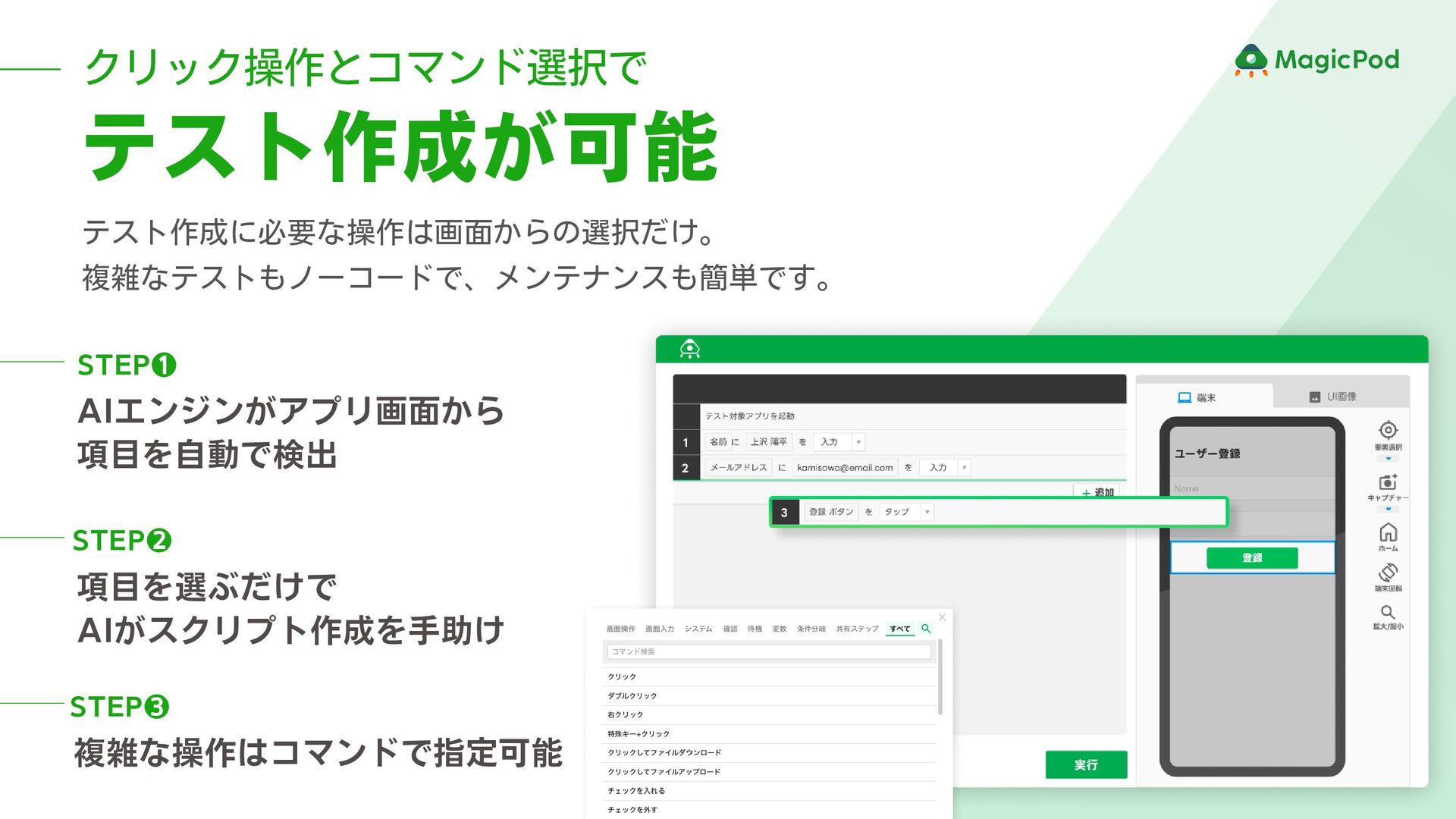 項目を選ぶだけで AIがスクリプト作成を手助け 複雑な操作はコマンドで指定可能 AIエンジンがアプリ画面から 項目を自動で検出 テスト作成が可能 テスト作成に必要な操作は画面からの選択だけ。 複雑なテストもノーコードで、メンテナンスも簡単です。 クリック操作とコマンド選択で STEP❷