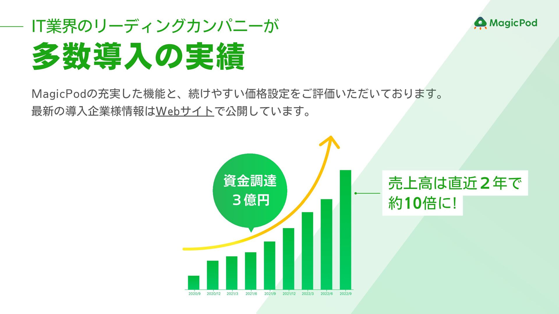 MagicPodの充実した機能と、続けやすい価格設定をご評価いただいております。 最新の導入企業様情報はWebサイトで公開しています。 多数導入の実績 IT業界のリーディングカンパニーが 売上高は直近2年で 約10倍に! 資金調達 3億円