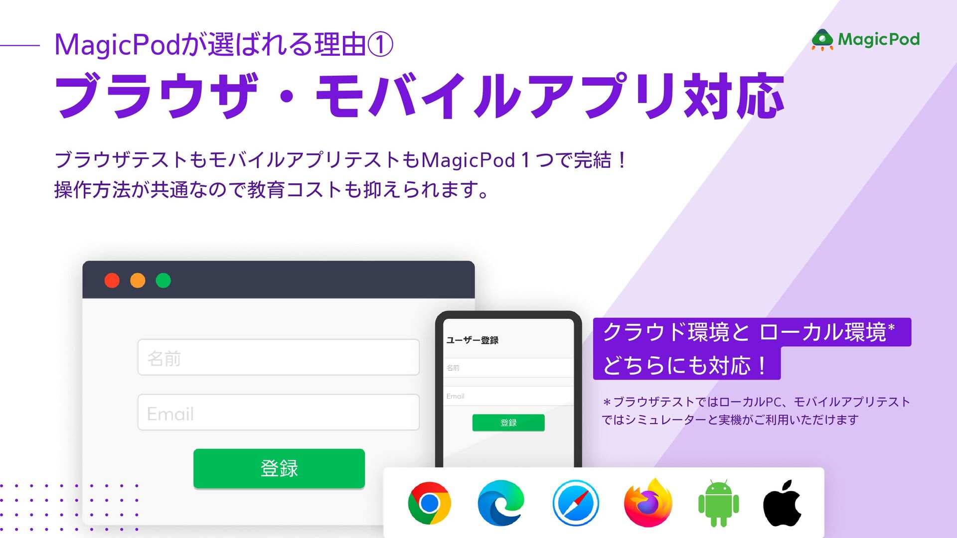 ブラウザ・モバイルアプリ対応 ブラウザテストもモバイルアプリテストもMagicPod1つで完結! 操作方法が共通なので教育コストも抑えられます。 MagicPodが選ばれる理由① クラウド環境と ローカル環境* どちらにも対応! *ブラウザテストではローカルPC、モバイルアプリテスト ではシミュレーターと実機がご利用いただけます