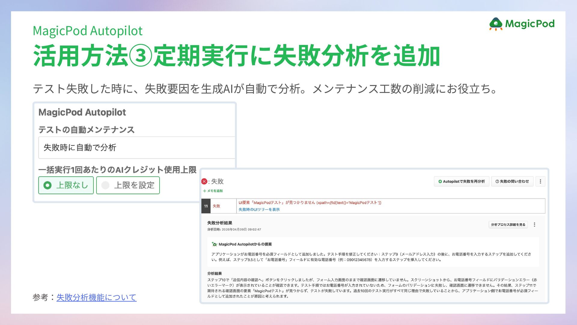 参考:失敗分析機能について https://support.magic-pod.com/hc/ja/articles/56508518852633