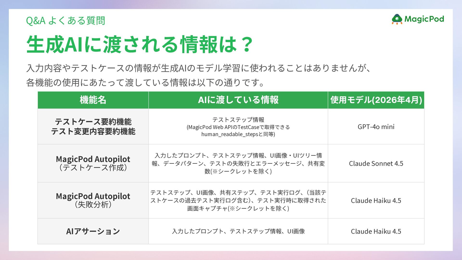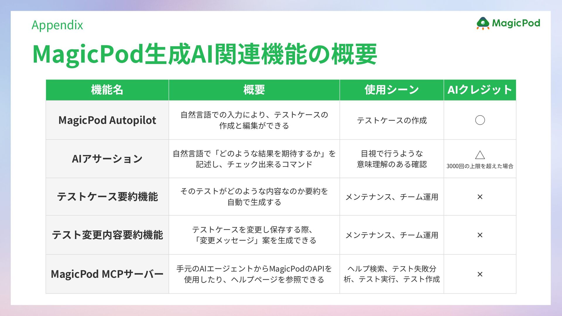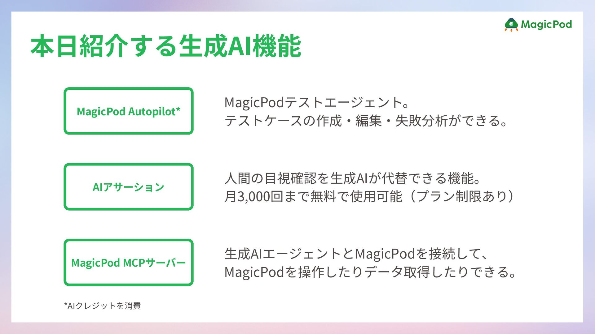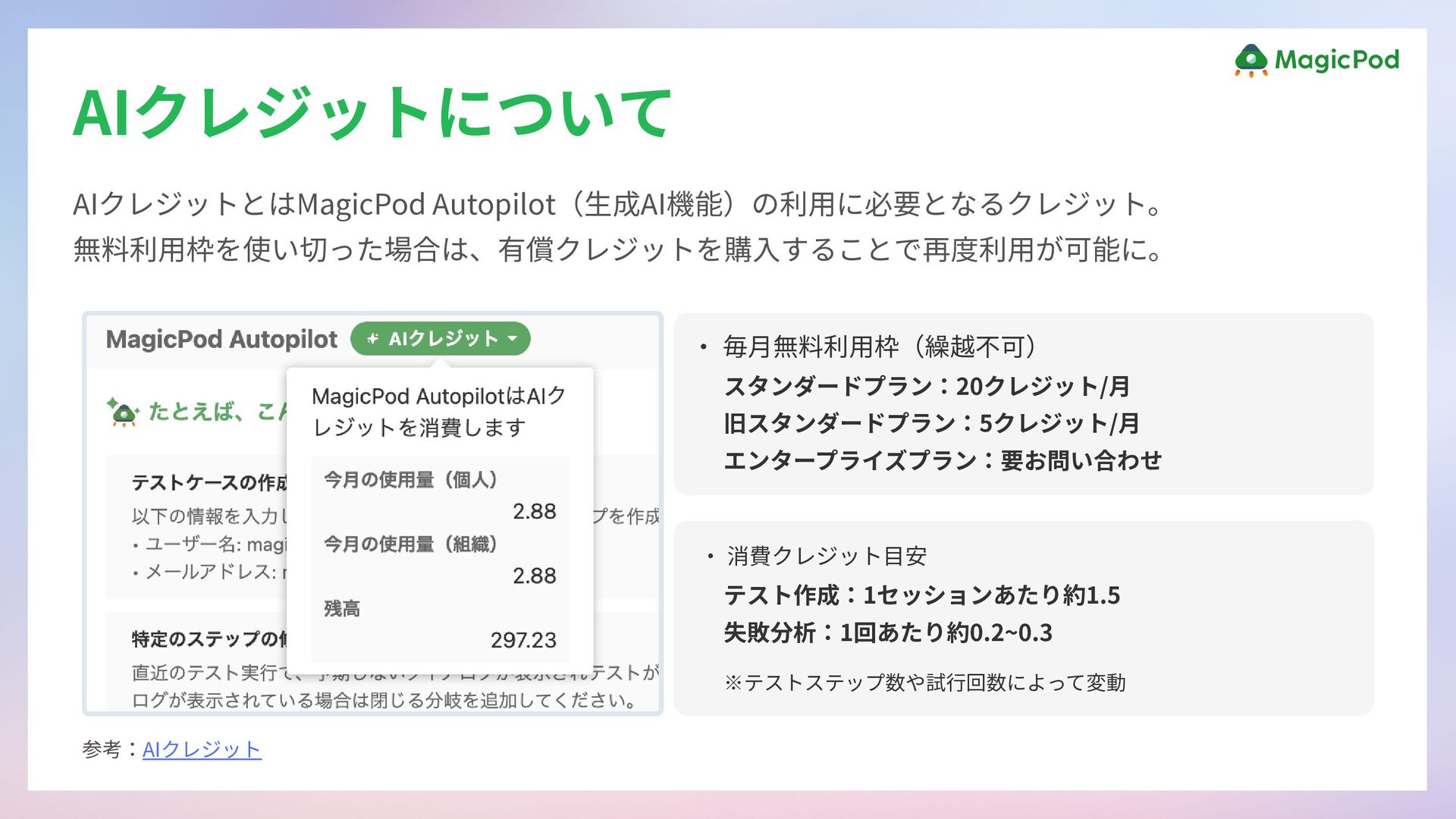 参考:AIクレジット https://support.magic-pod.com/hc/ja/articles/46186888063769#01JSPETSNEYC08V6YBWFP9C9XH