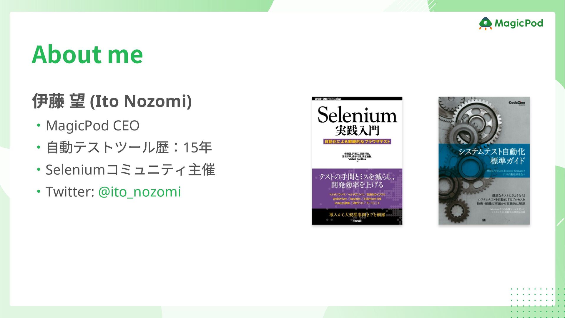 About me 伊藤 望 (Ito Nozomi) ・MagicPod CEO ・自動テストツール歴:15 年