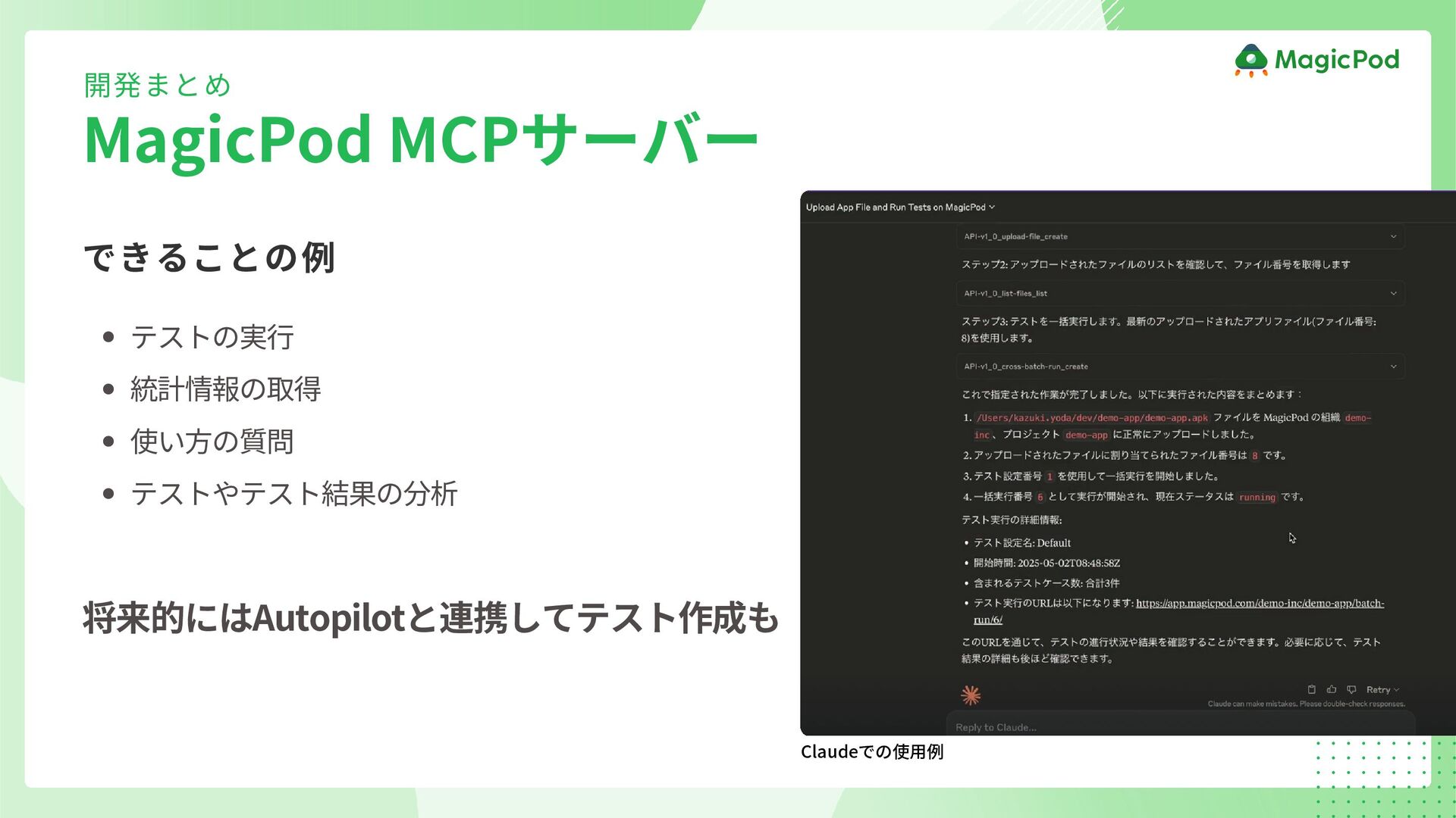 テストの実行 統計情報の取得 使い方の質問 テストやテスト結果の分析 将来的にはAutopilotと連携してテスト作成も MagicPod MCPサーバー できることの例 開発まとめ Claudeでの使用例