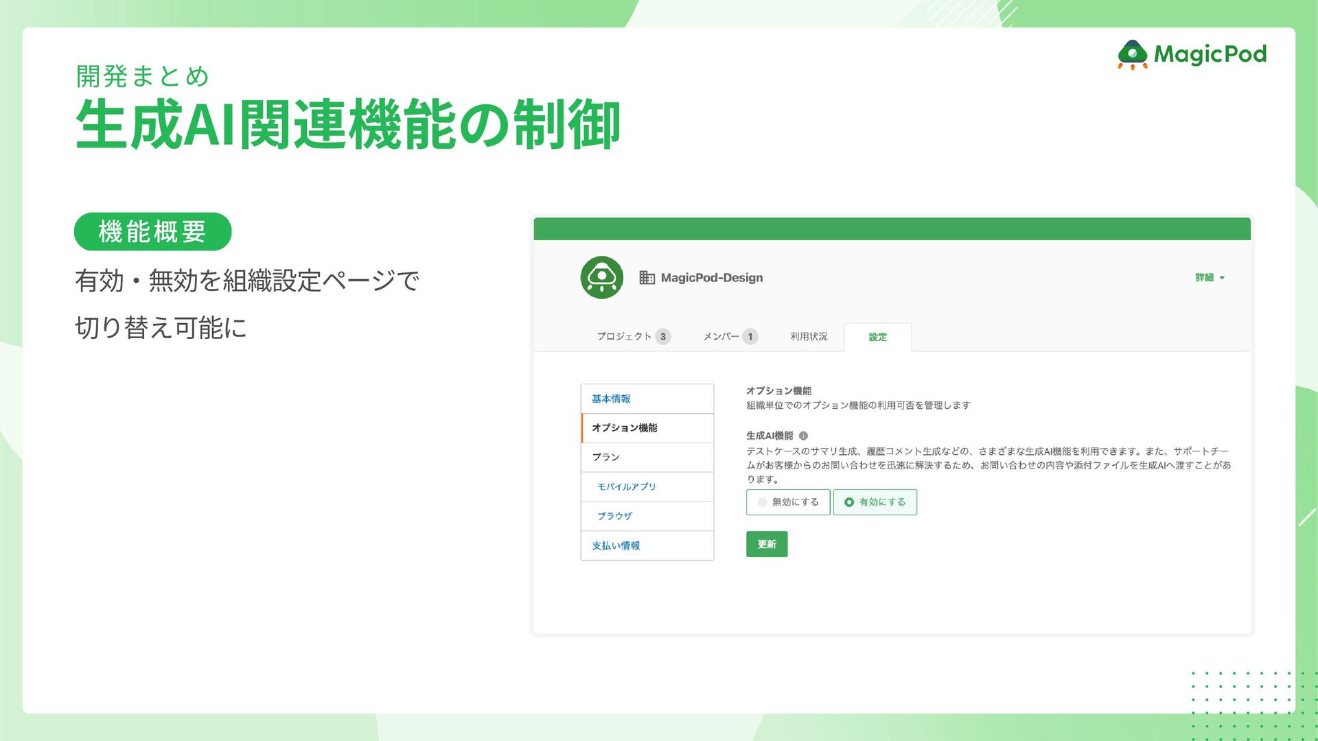 有効・無効を組織設定ページで 切り替え可能に 生成AI関連機能の制御 機能概要 開発まとめ