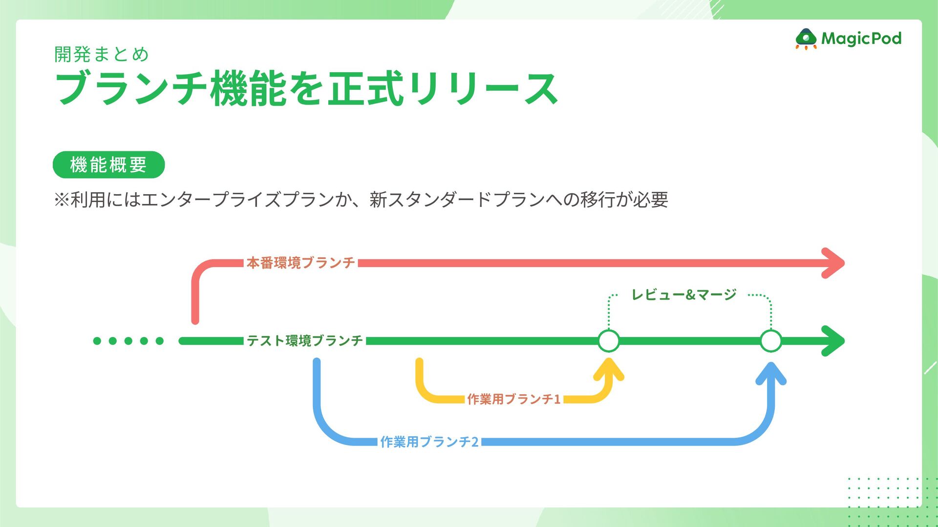 テスト環境ブランチ 本番環境ブランチ 作業用ブランチ1 作業用ブランチ2 ※利用にはエンタープライズプランか、新スタンダードプランへの移行が必要 ブランチ機能を正式リリース 機能概要 開発まとめ レビュー&マージ