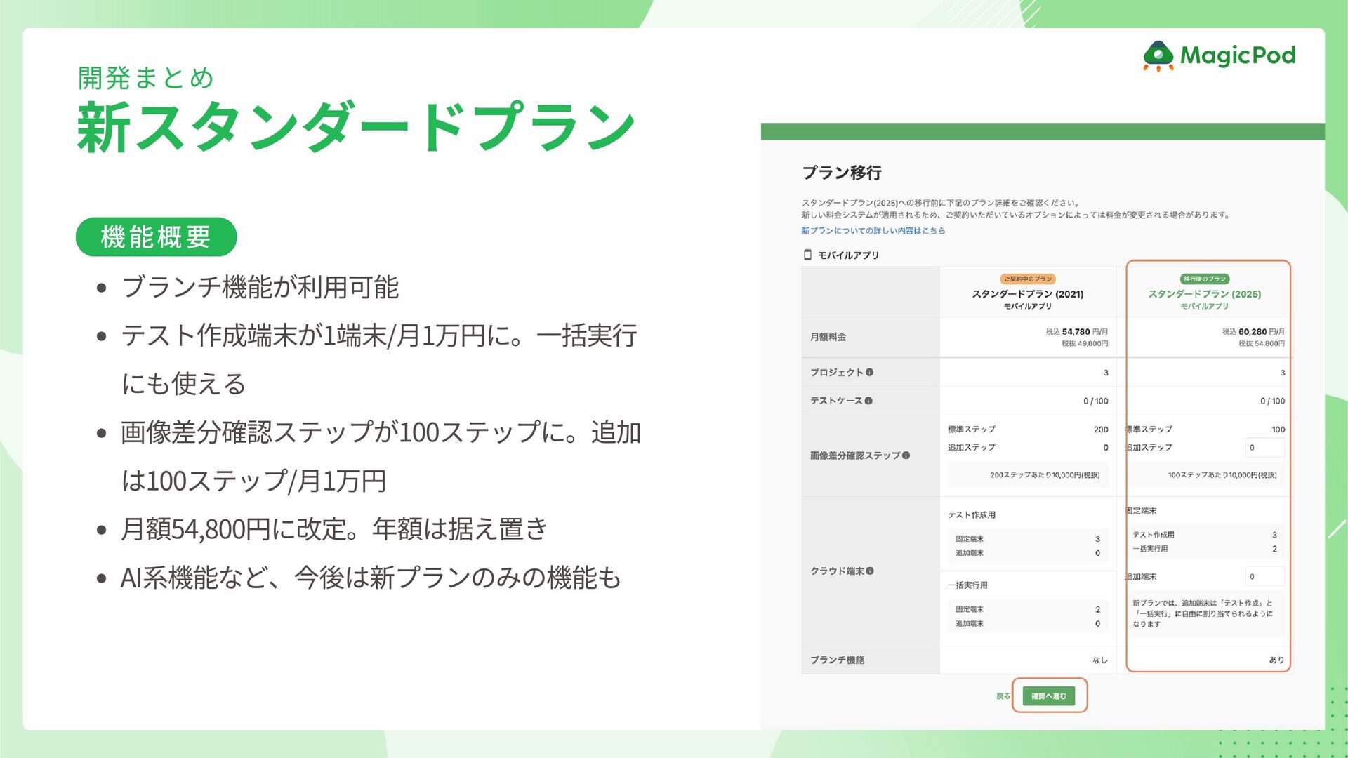 ブランチ機能が利用可能 テスト作成端末が1端末/月1万円に。一括実行 にも使える 画像差分確認ステップが100ステップに。追加 は100ステップ/月1万円 月額54,800円に改定。年額は据え置き AI系機能など、今後は新プランのみの機能も 新スタンダードプラン 機能概要 開発まとめ