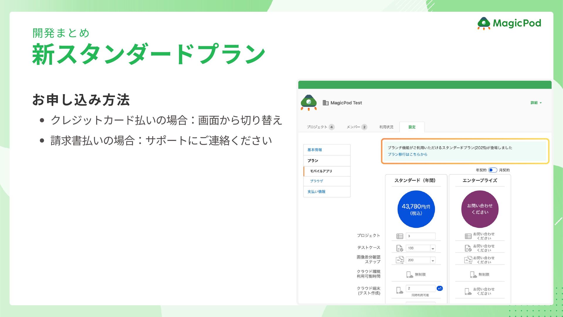 クレジットカード払いの場合:画面から切り替え 請求書払いの場合:サポートにご連絡ください 新スタンダードプラン 開発まとめ お申し込み方法