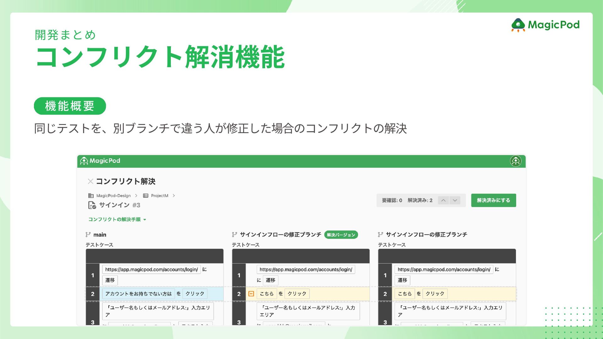 同じテストを、別ブランチで違う人が修正した場合のコンフリクトの解決 コンフリクト解消機能 機能概要 開発まとめ
