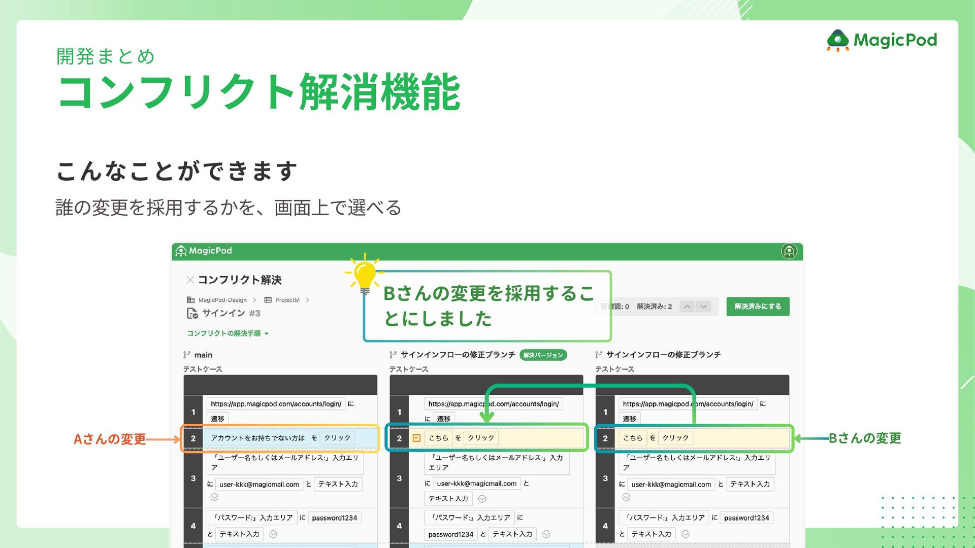 Bさんの変更 誰の変更を採用するかを、画面上で選べる コンフリクト解消機能 開発まとめ こんなことができます Aさんの変更 Bさんの変更を採用するこ とにしました