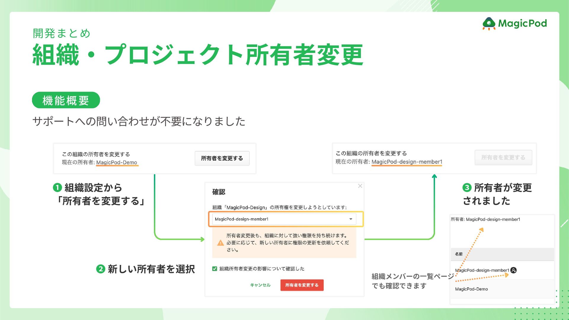 組織メンバーの一覧ページ でも確認できます サポートへの問い合わせが不要になりました 組織・プロジェクト所有者変更 開発まとめ 機能概要 ❶ 組織設定から 「所有者を変更する」 ❷