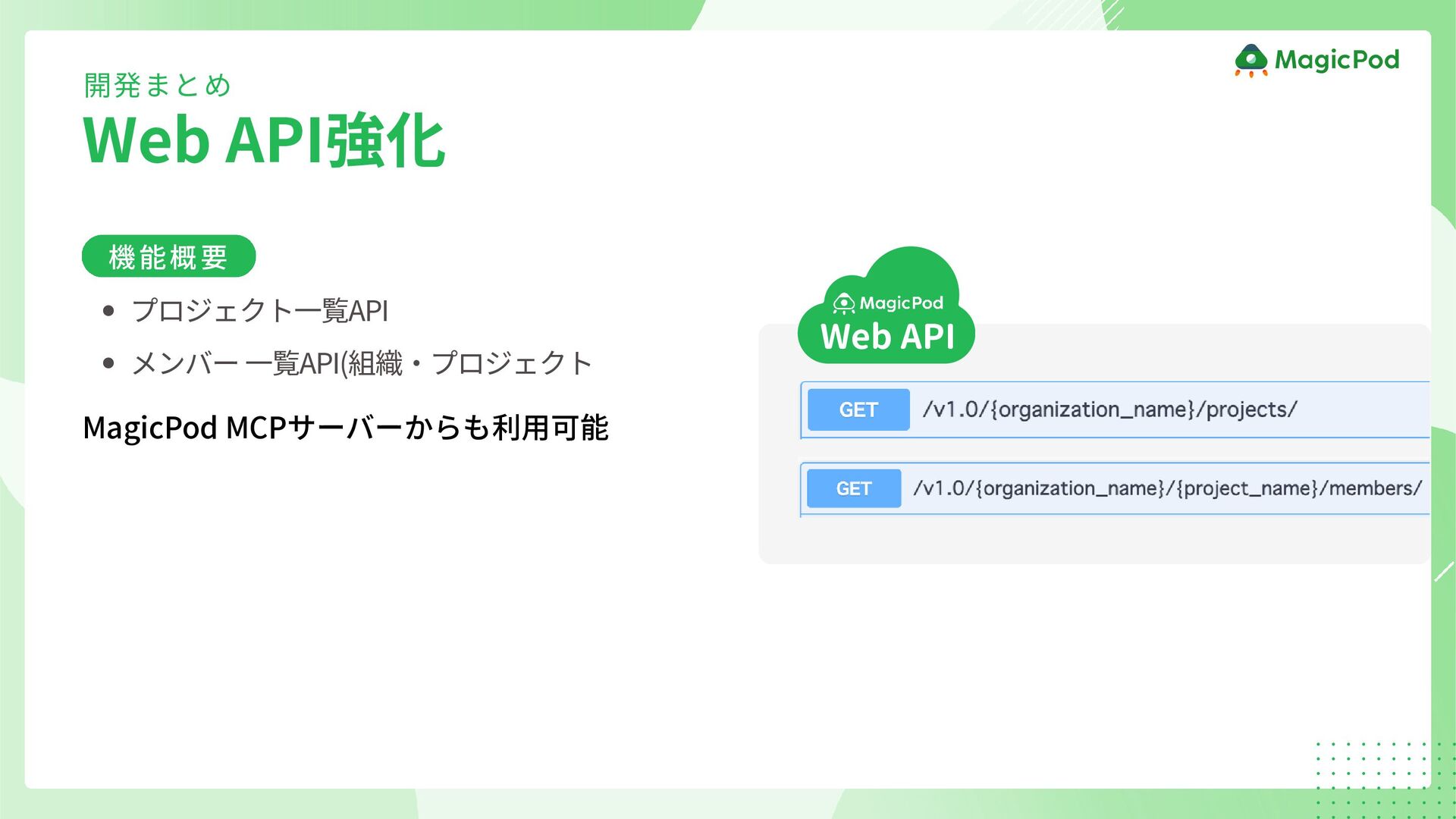 プロジェクト一覧API メンバー 一覧API(組織・プロジェクト Web API強化 開発まとめ 機能概要 MagicPod MCPサーバーからも利用可能 Web