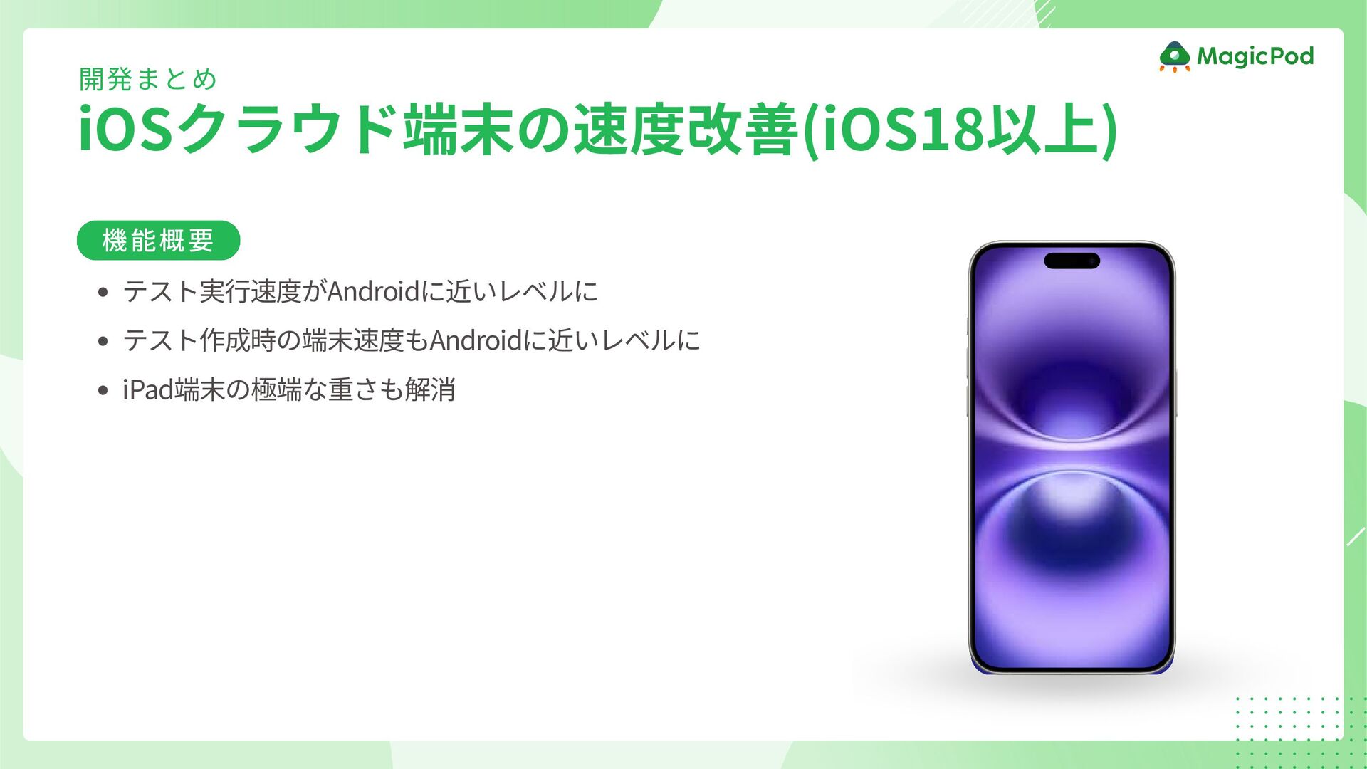 テスト実行速度がAndroidに近いレベルに テスト作成時の端末速度もAndroidに近いレベルに iPad端末の極端な重さも解消 iOSクラウド端末の速度改善(iOS18以上) 開発まとめ 機能概要