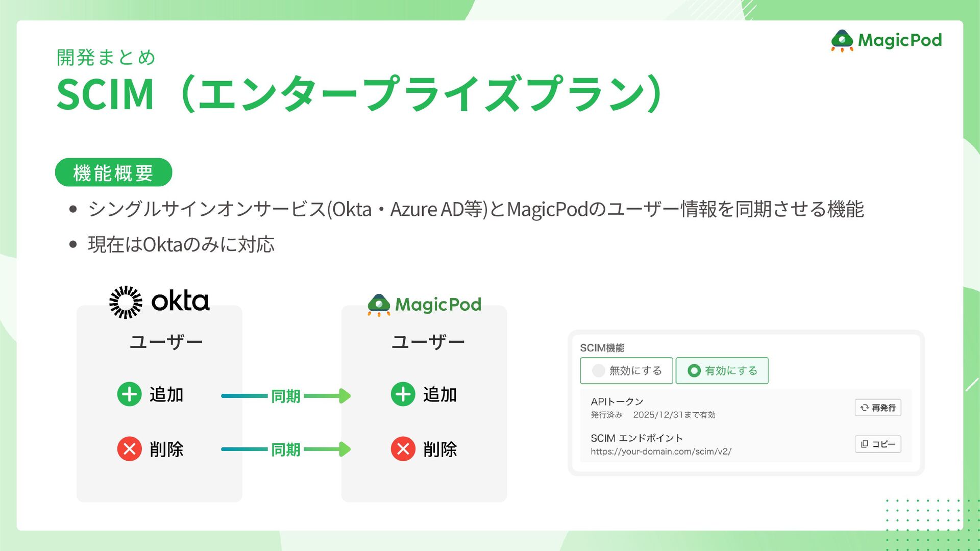 削除 削除 同期 追加 追加 同期 シングルサインオンサービス(Okta・Azure AD等)とMagicPodのユーザー情報を同期させる機能 現在はOktaのみに対応 SCIM(エンタープライズプラン)