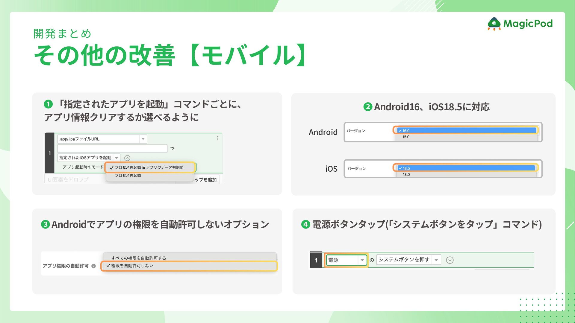 ❷ Android16、iOS18.5に対応 ❶ 「指定されたアプリを起動」コマンドごとに、 アプリ情報クリアするか選べるように ❸ Androidでアプリの権限を自動許可しないオプション ❹ 電源ボタンタップ( 「システムボタンをタップ」コマンド)