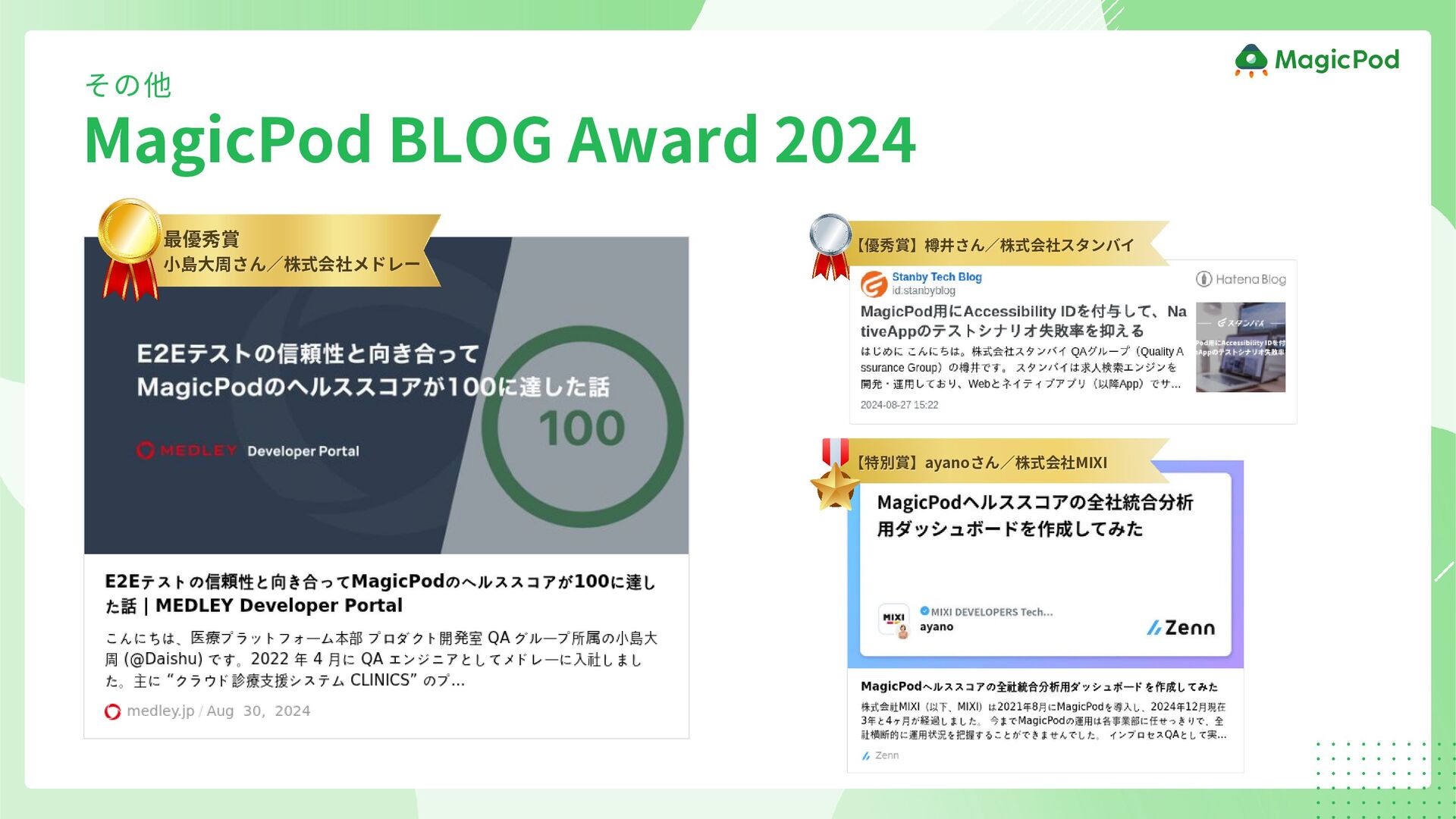 【優秀賞】樽井さん/株式会社スタンバイ 【優秀賞】樽井さん/株式会社スタンバイ 【特別賞】ayanoさん/株式会社MIXI 【特別賞】ayanoさん/株式会社MIXI 最優秀賞 小島大周さん/株式会社メドレー 最優秀賞 小島大周さん/株式会社メドレー MagicPod BLOG