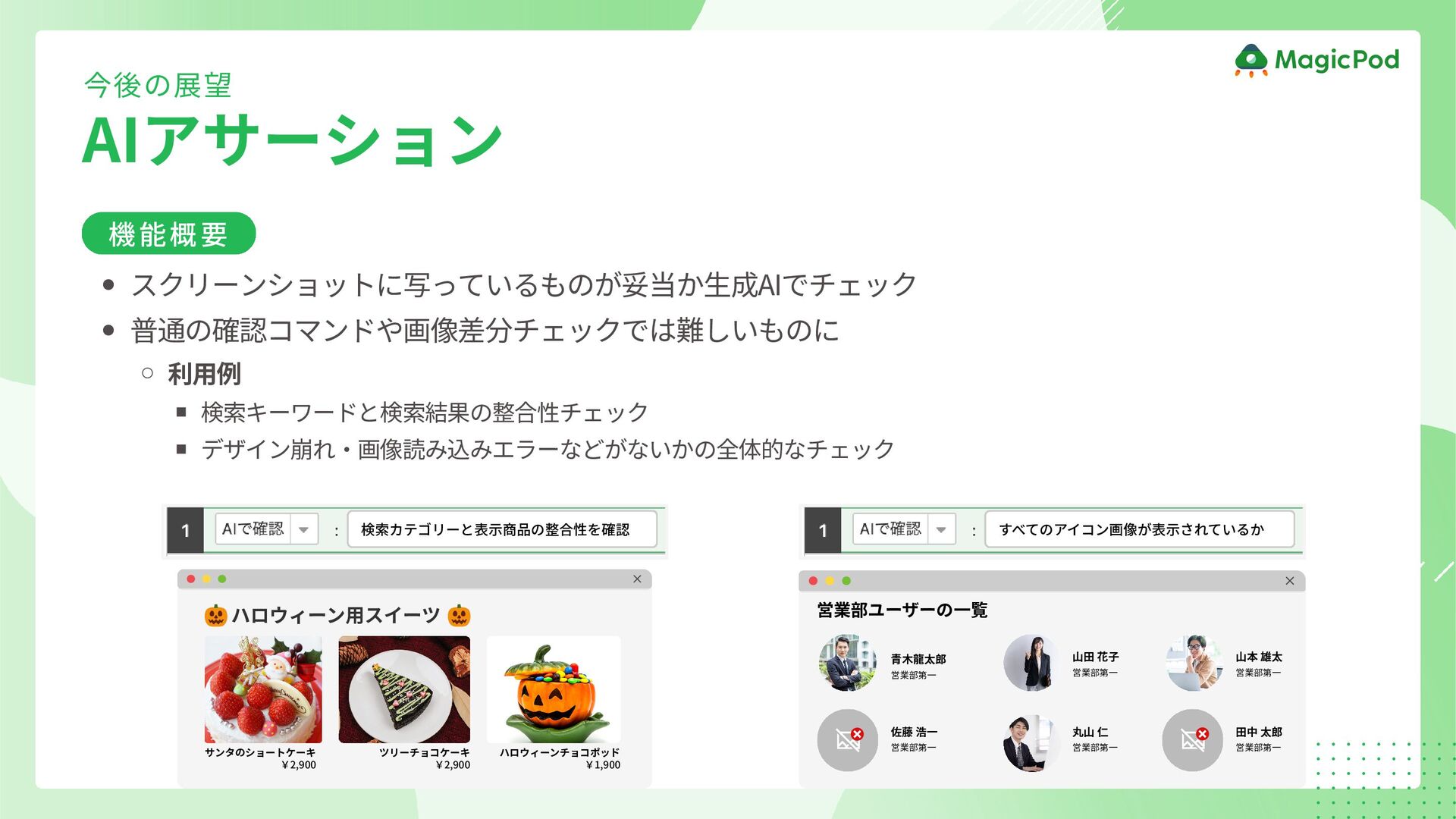 すべてのアイコン画像が表示されているか 検索カテゴリーと表示商品の整合性を確認 スクリーンショットに写っているものが妥当か生成AIでチェック 普通の確認コマンドや画像差分チェックでは難しいものに 利用例 検索キーワードと検索結果の整合性チェック デザイン崩れ・画像読み込みエラーなどがないかの全体的なチェック AIアサーション 機能概要 今後の展望