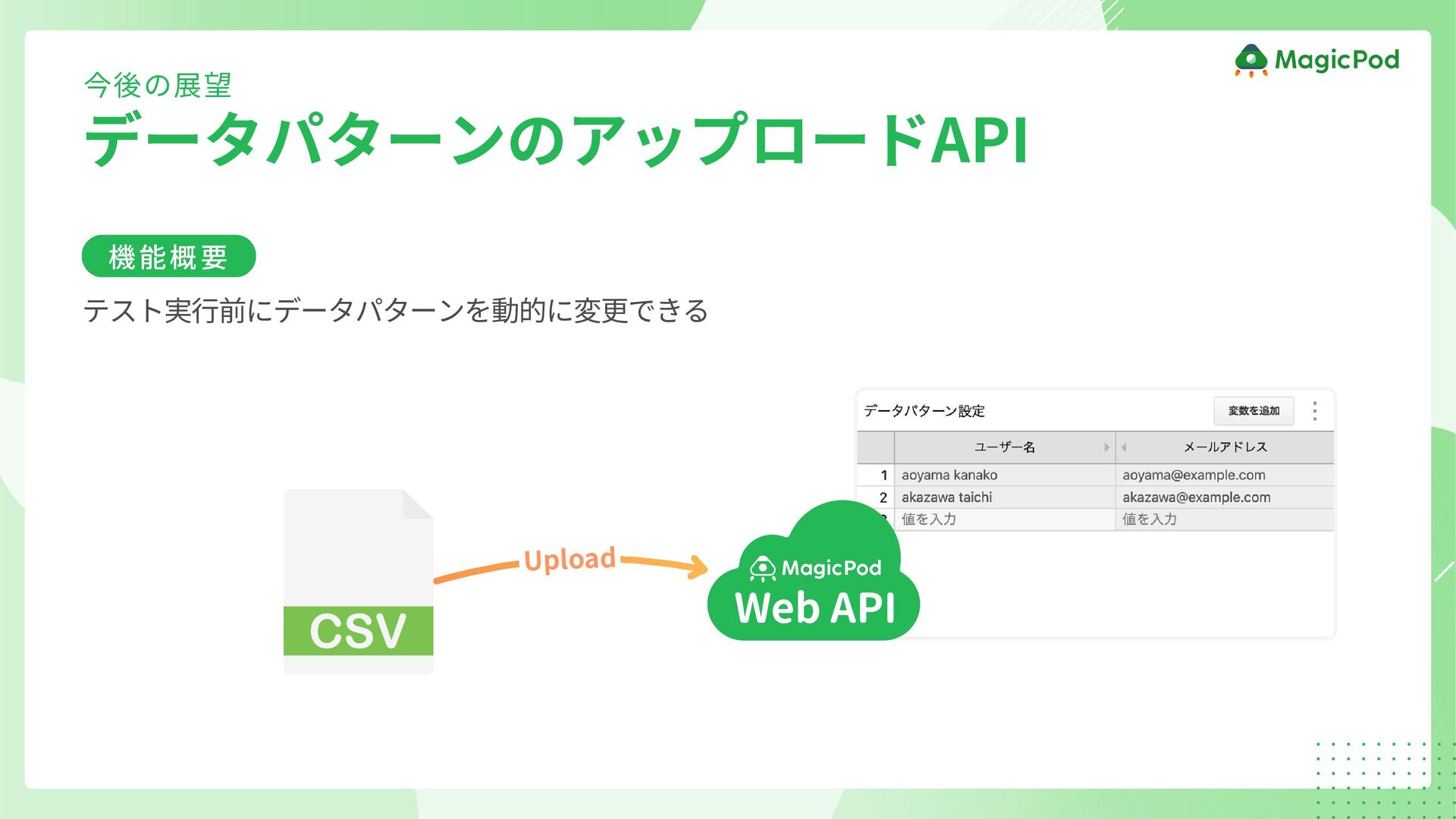 機能概要 Web API Upload テスト実行前にデータパターンを動的に変更できる データパターンのアップロードAPI 今後の展望 機能概要