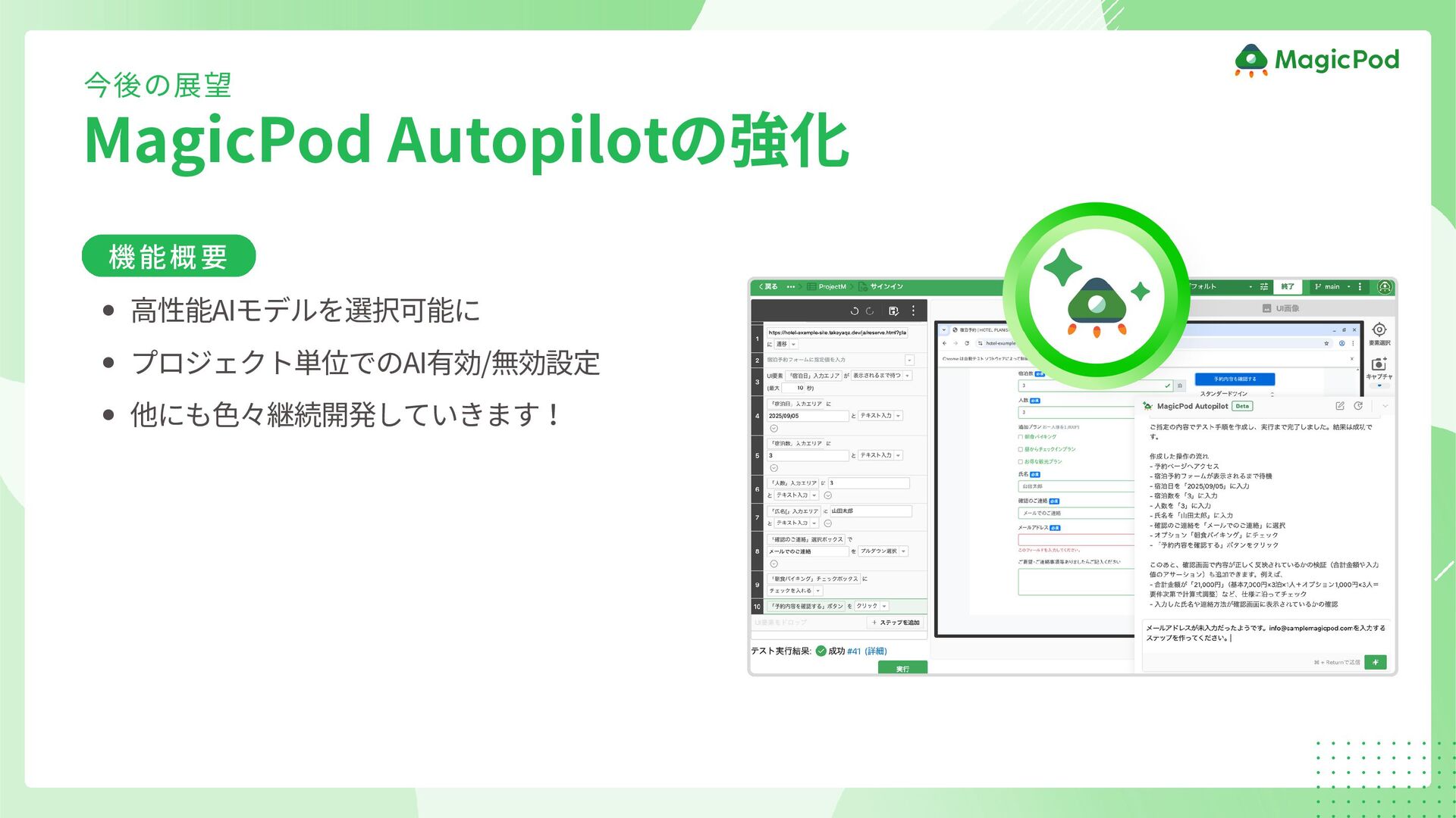 高性能AIモデルを選択可能に プロジェクト単位でのAI有効/無効設定 他にも色々継続開発していきます! MagicPod Autopilotの強化 機能概要 今後の展望 機能概要
