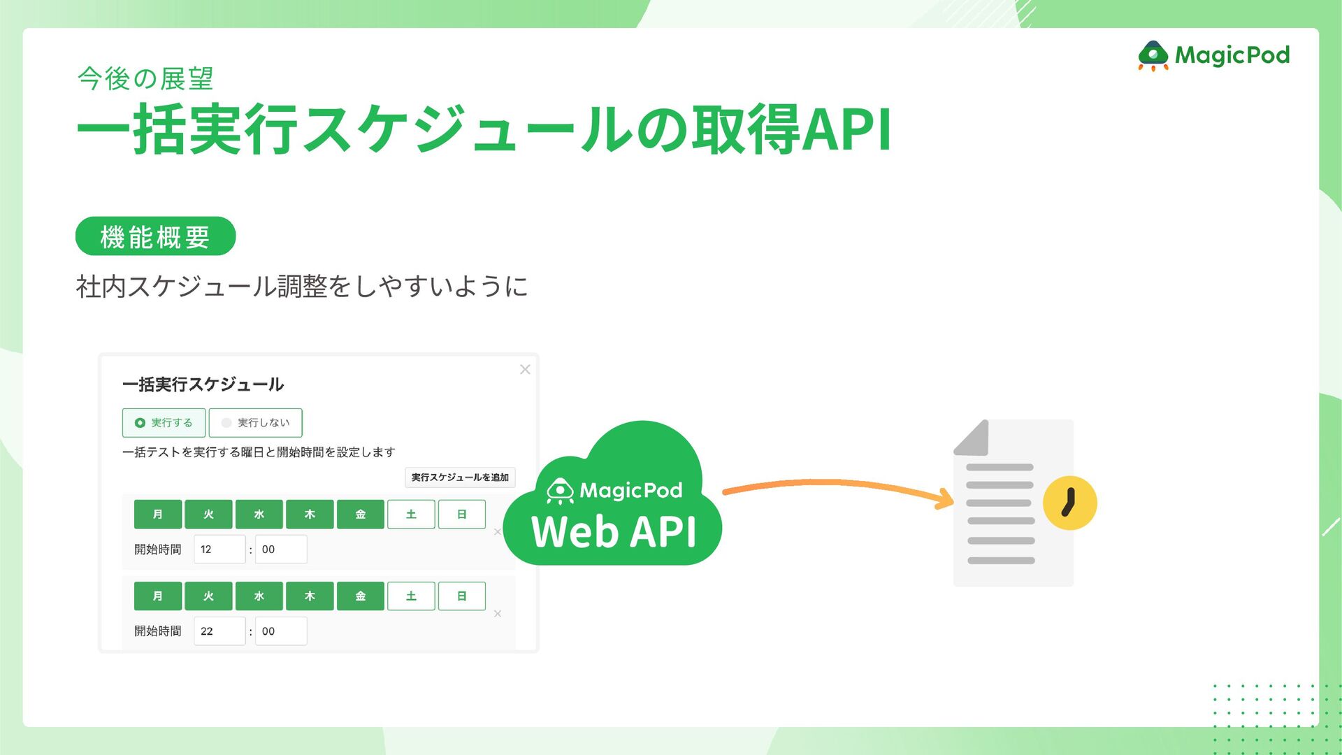 機能概要 Web API 社内スケジュール調整をしやすいように 一括実行スケジュールの取得API 今後の展望 機能概要