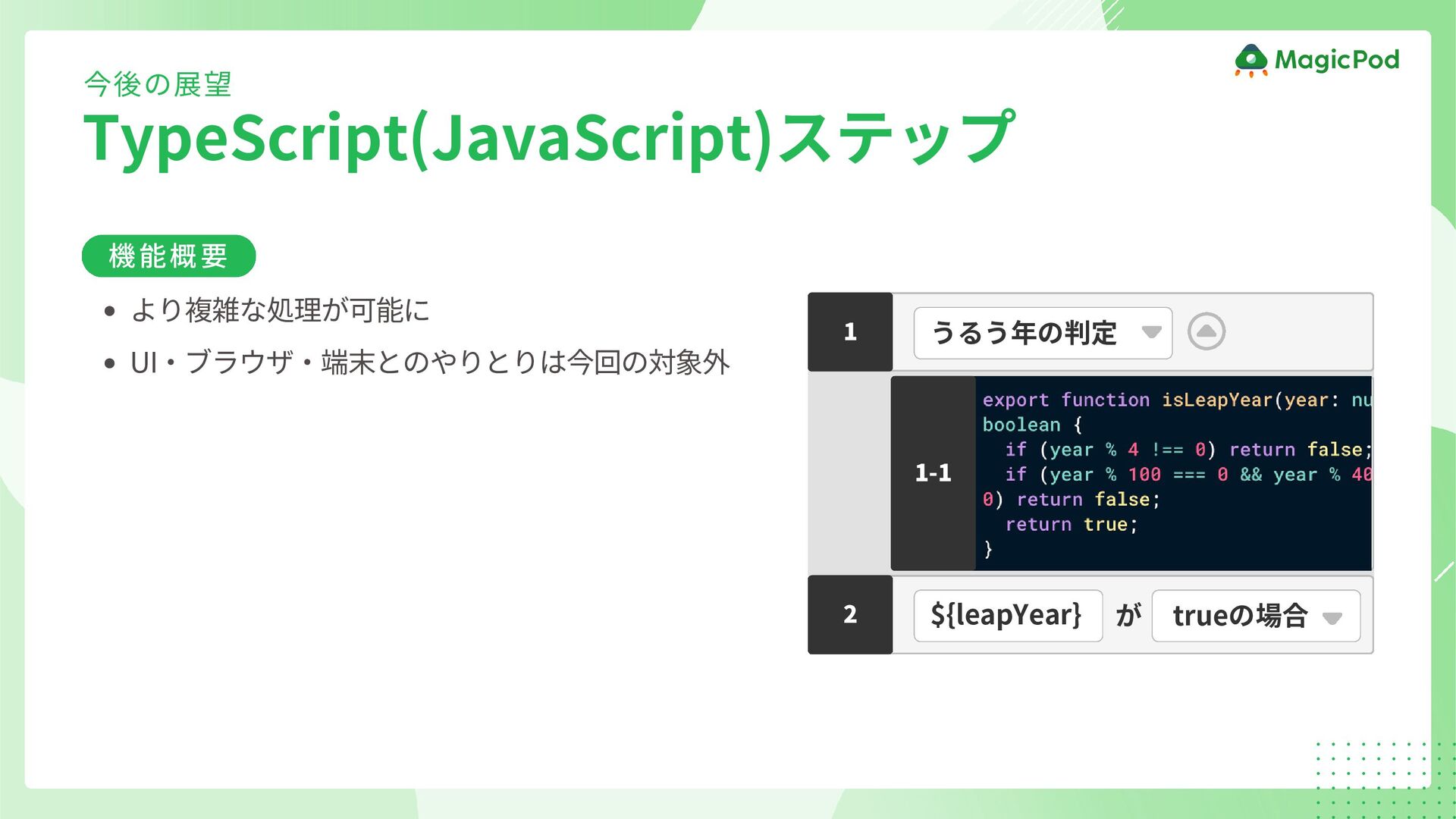 より複雑な処理が可能に UI・ブラウザ・端末とのやりとりは今回の対象外 TypeScript(JavaScript)ステップ 機能概要 今後の展望 機能概要 1-1 1 うるう年の判定 2