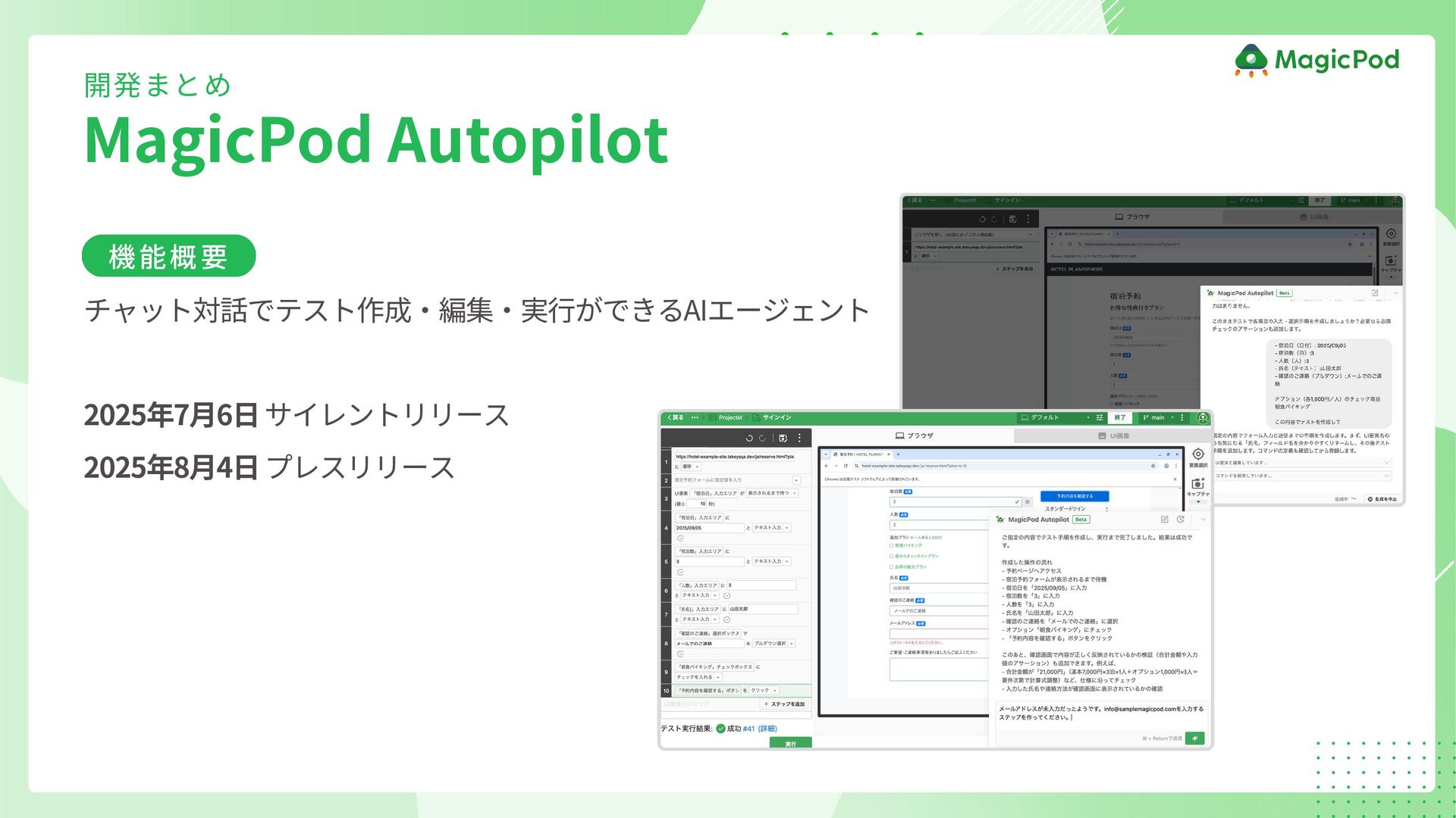 チャット対話でテスト作成・編集・実行ができるAIエージェント 2025年7月6日 サイレントリリース 2025年8月4日 プレスリリース MagicPod Autopilot 機能概要 開発まとめ