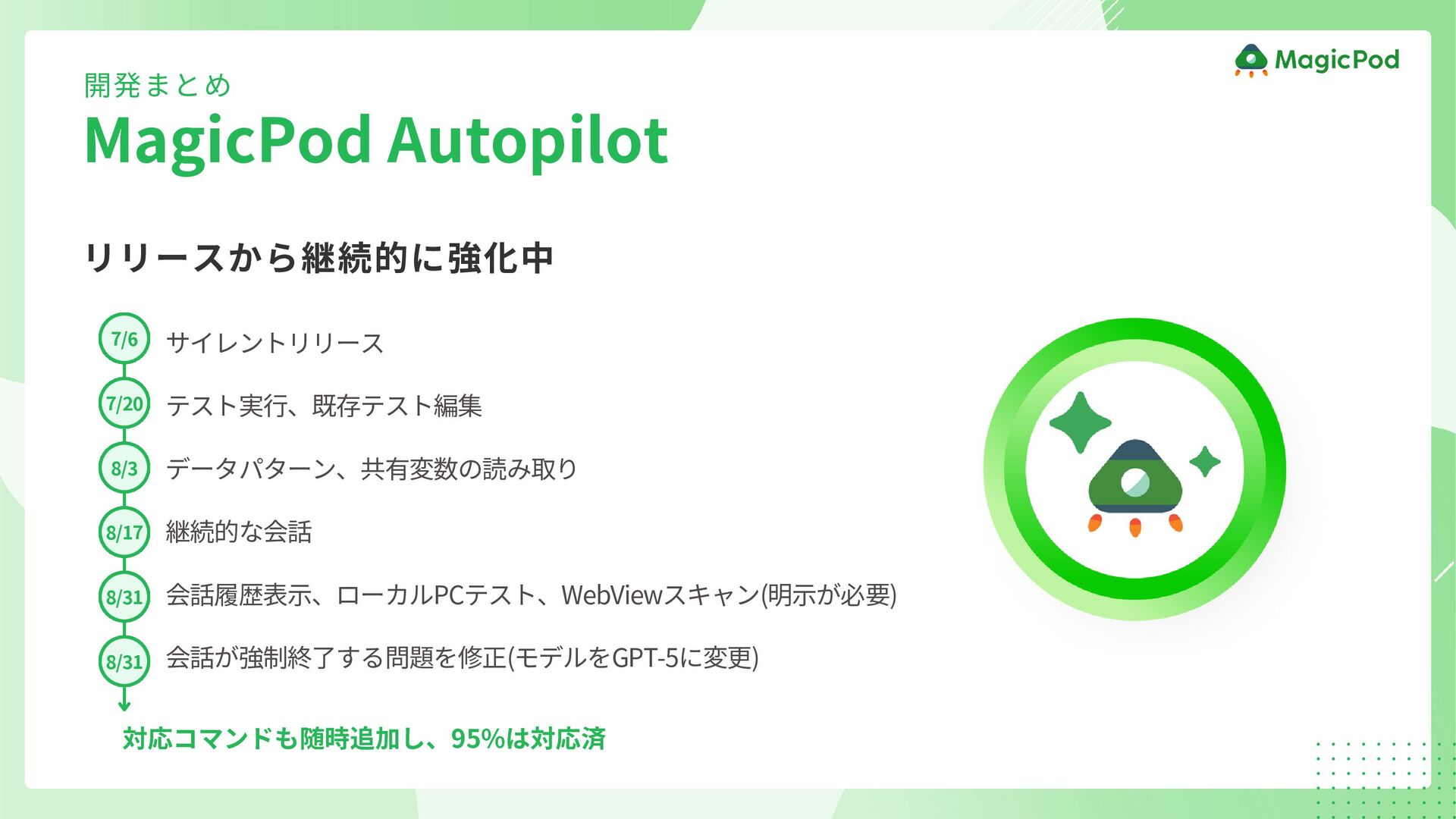会話履歴表示、ローカルPCテスト、WebViewスキャン(明示が必要) 会話が強制終了する問題を修正(モデルをGPT-5に変更) MagicPod Autopilot リリースから継続的に強化中 開発まとめ 対応コマンドも随時追加し、95%は対応済