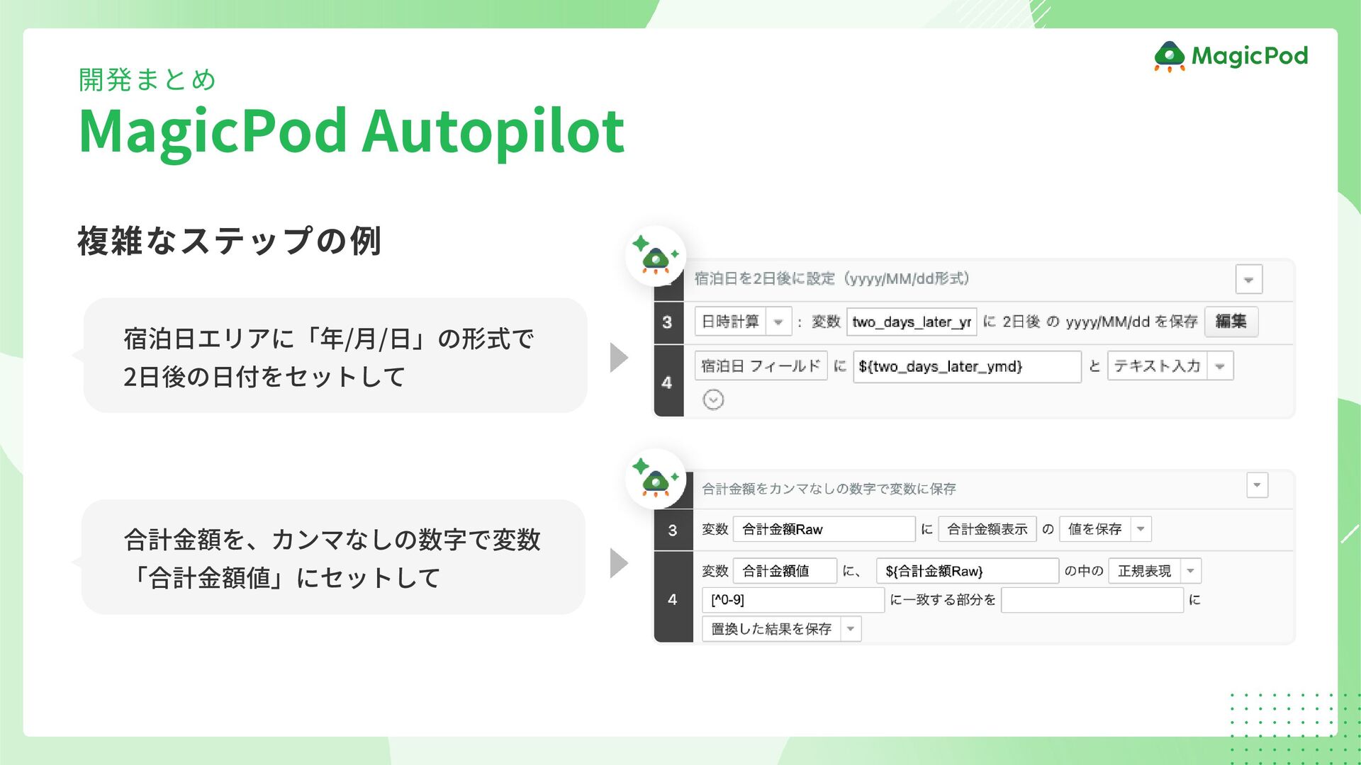 複雑なステップの例 MagicPod Autopilot 開発まとめ 宿泊日エリアに「年/月/日」の形式で 2日後の日付をセットして 合計金額を、カンマなしの数字で変数 「合計金額値」にセットして