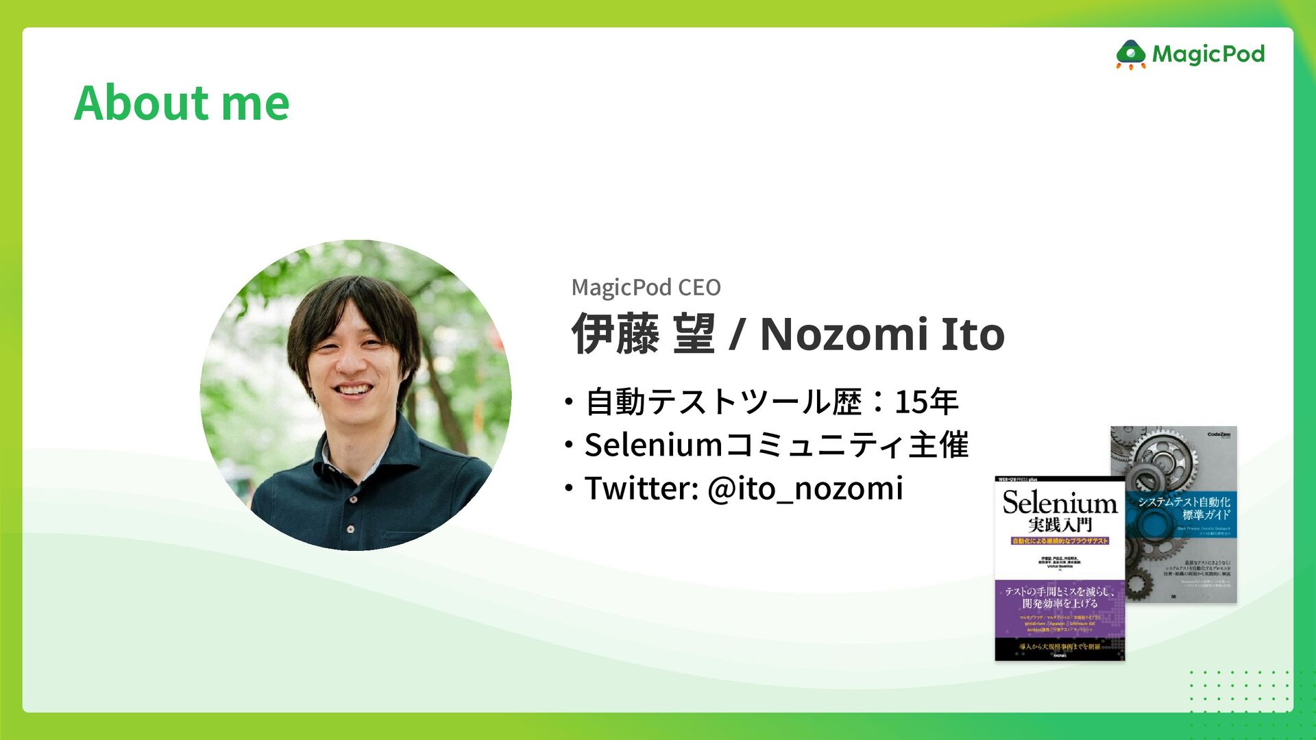 伊藤 望 / Nozomi Ito About me ・自動テストツール歴:15年 ・Seleniumコミュニティ主催 ・Twitter: