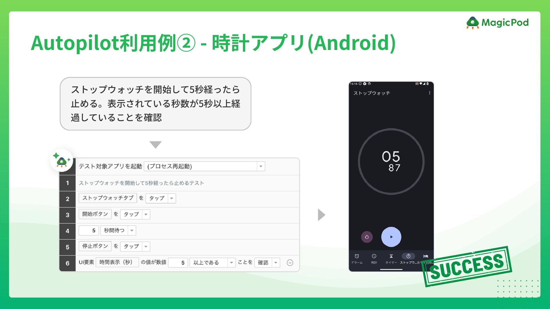 ストップウォッチを開始して5秒経ったら 止める。表示されている秒数が5秒以上経 過していることを確認 Autopilot利用例② - 時計アプリ(Android)
