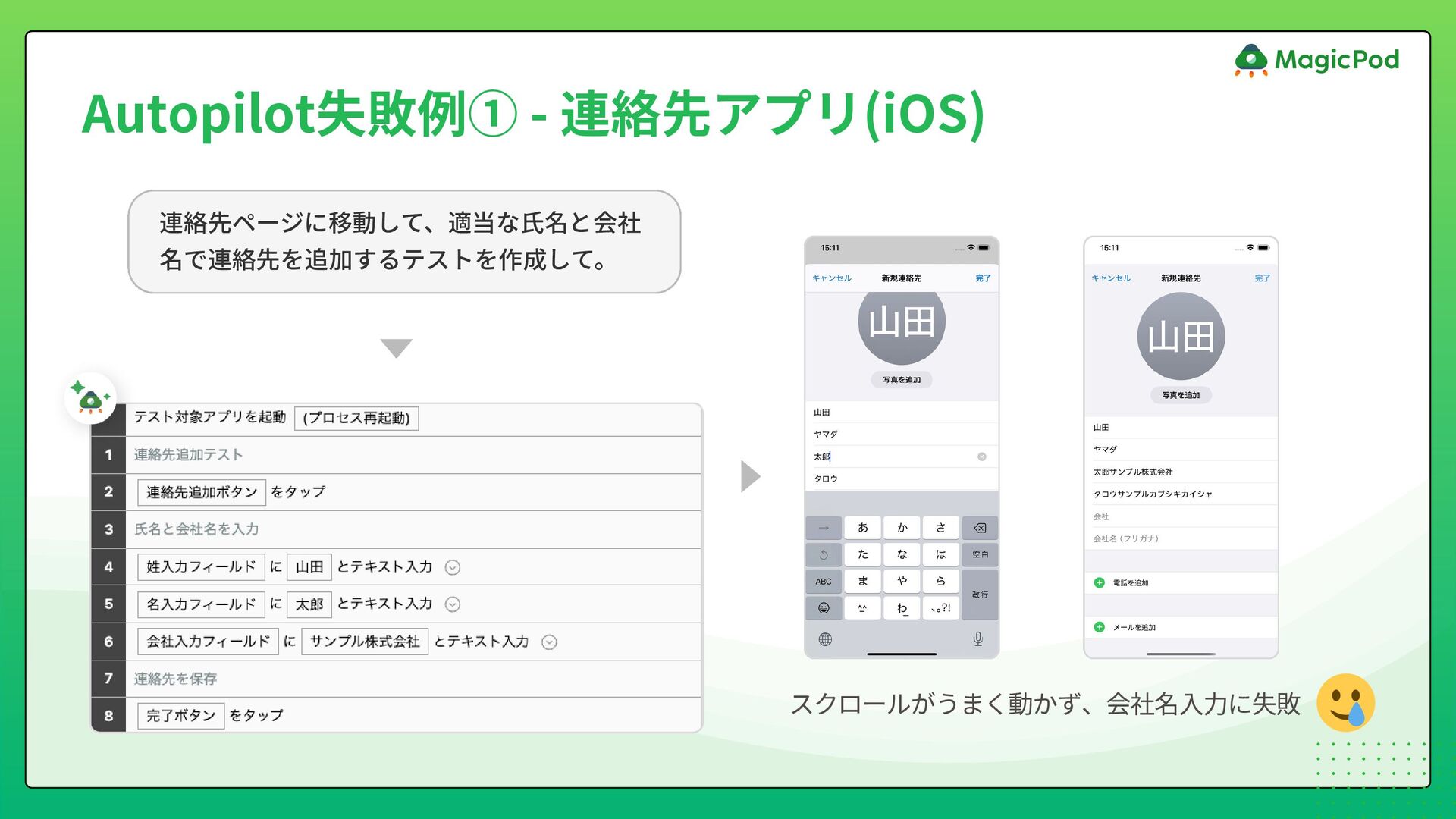 連絡先ページに移動して、適当な氏名と会社 名で連絡先を追加するテストを作成して。 Autopilot失敗例① - 連絡先アプリ(iOS) スクロールがうまく動かず、会社名入力に失敗