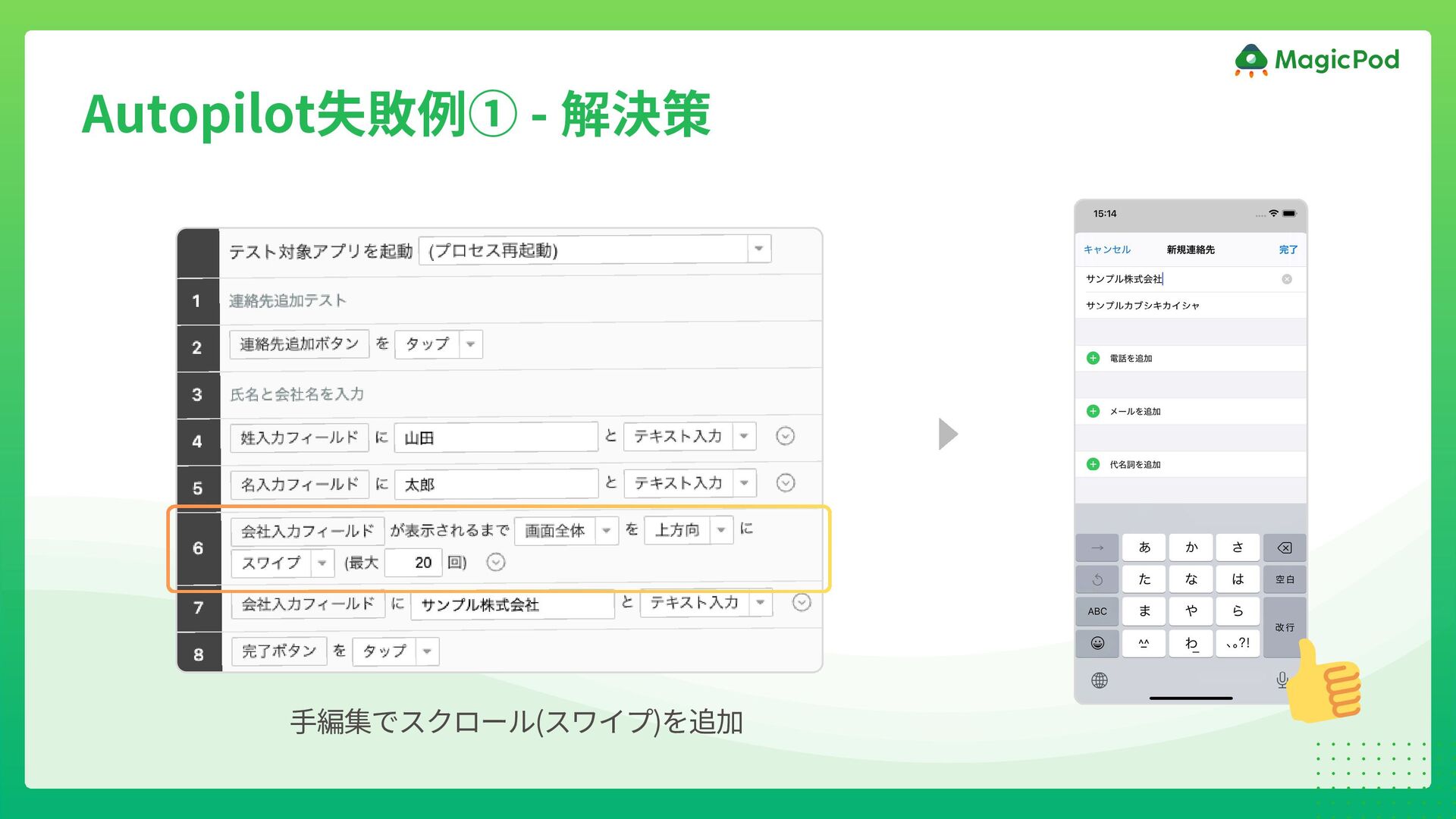 Autopilot失敗例① - 解決策 手編集でスクロール(スワイプ)を追加