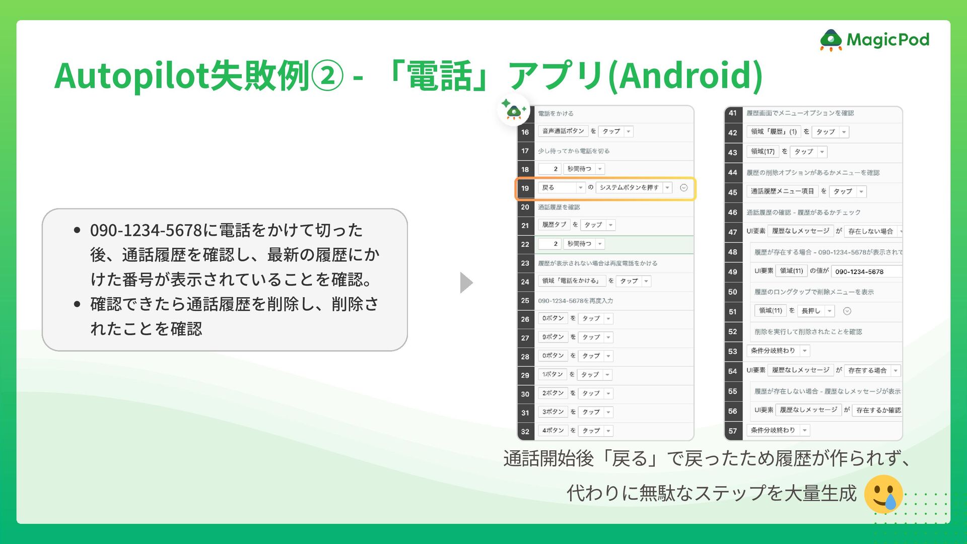 090-1234-5678に電話をかけて切った 後、通話履歴を確認し、最新の履歴にか けた番号が表示されていることを確認。 確認できたら通話履歴を削除し、削除さ れたことを確認 Autopilot失敗例② - 「電話」アプリ(Android) 通話開始後「戻る」で戻ったため履歴が作られず、 代わりに無駄なステップを大量生成