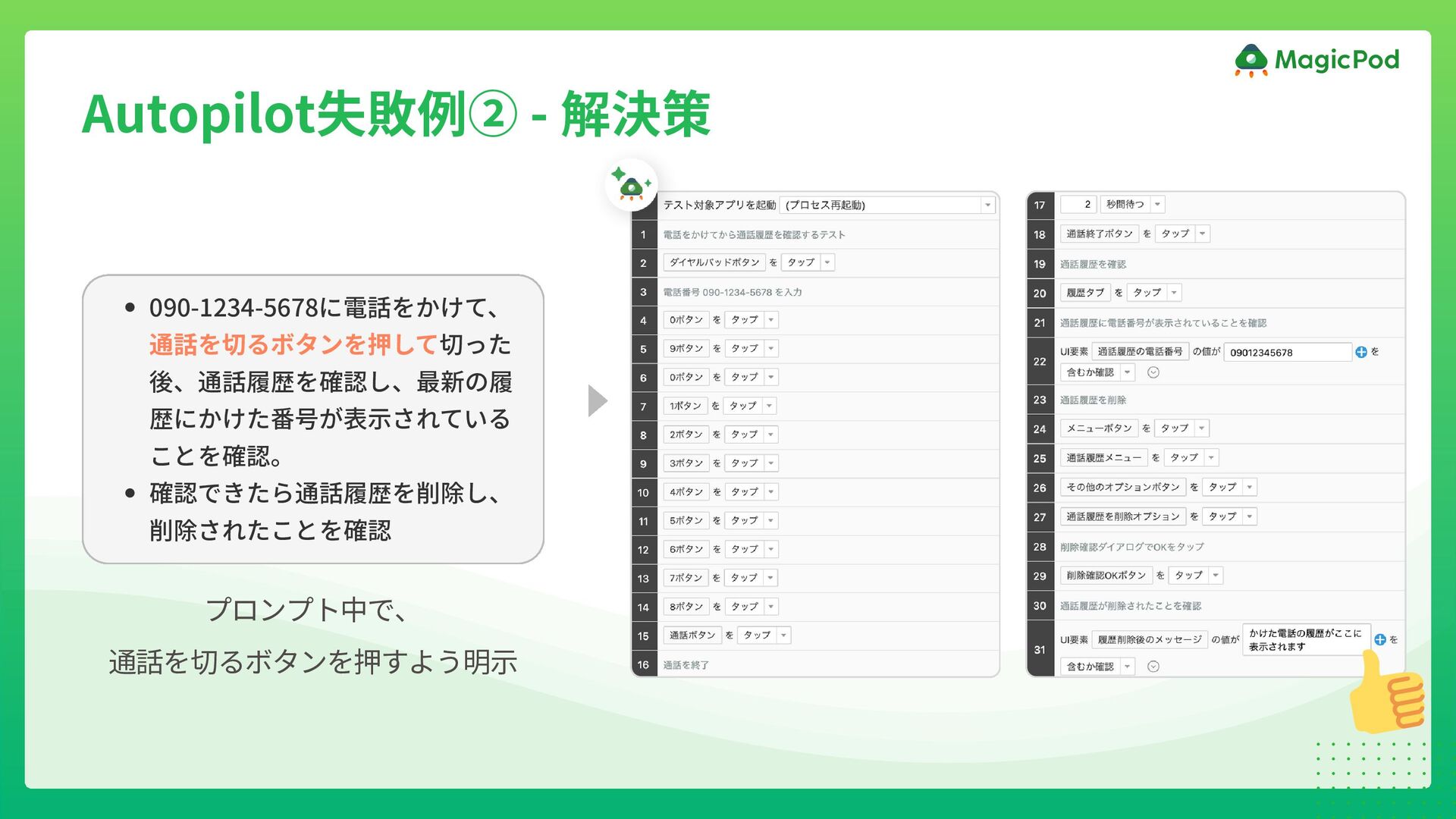 090-1234-5678に電話をかけて、 通話を切るボタンを押して切った 後、通話履歴を確認し、最新の履 歴にかけた番号が表示されている ことを確認。 確認できたら通話履歴を削除し、 削除されたことを確認 Autopilot失敗例② - 解決策