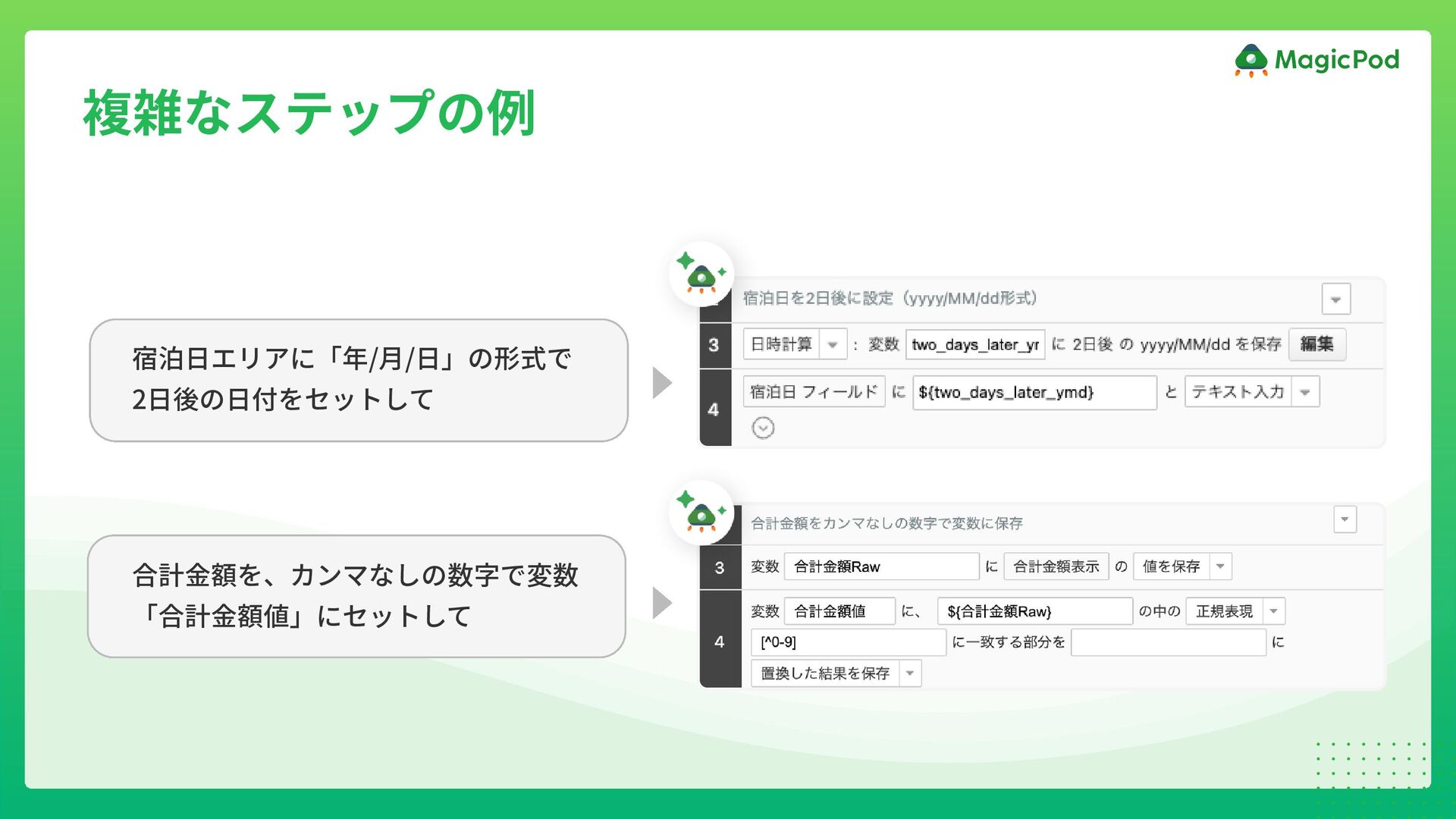 複雑なステップの例 宿泊日エリアに「年/月/日」の形式で 2日後の日付をセットして 合計金額を、カンマなしの数字で変数 「合計金額値」にセットして