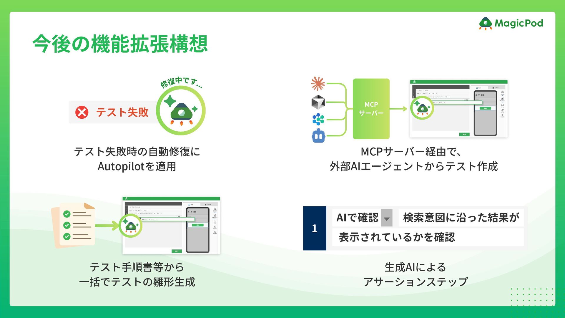 MCP サーバー テスト失敗 修復中です... MCPサーバー経由で、 外部AIエージェントからテスト作成 今後の機能拡張構想 テスト失敗時の自動修復に Autopilotを適用 AIで確認