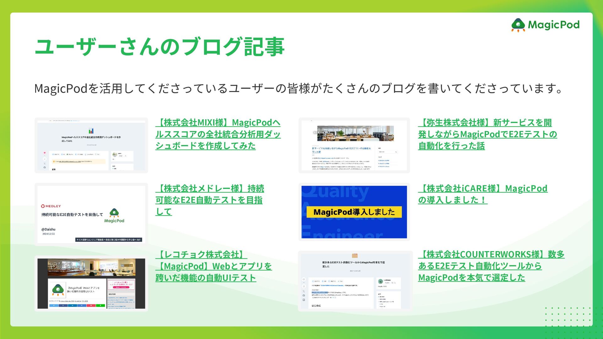 【株式会社MIXI様】MagicPodヘ ルススコアの全社統合分析用ダッ シュボードを作成してみた 【弥生株式会社様】新サービスを開 発しながらMagicPodでE2Eテストの 自動化を行った話 【株式会社iCARE様】MagicPod の導入しました! 【株式会社COUNTERWORKS様】数多 あるE2Eテスト自動化ツールから