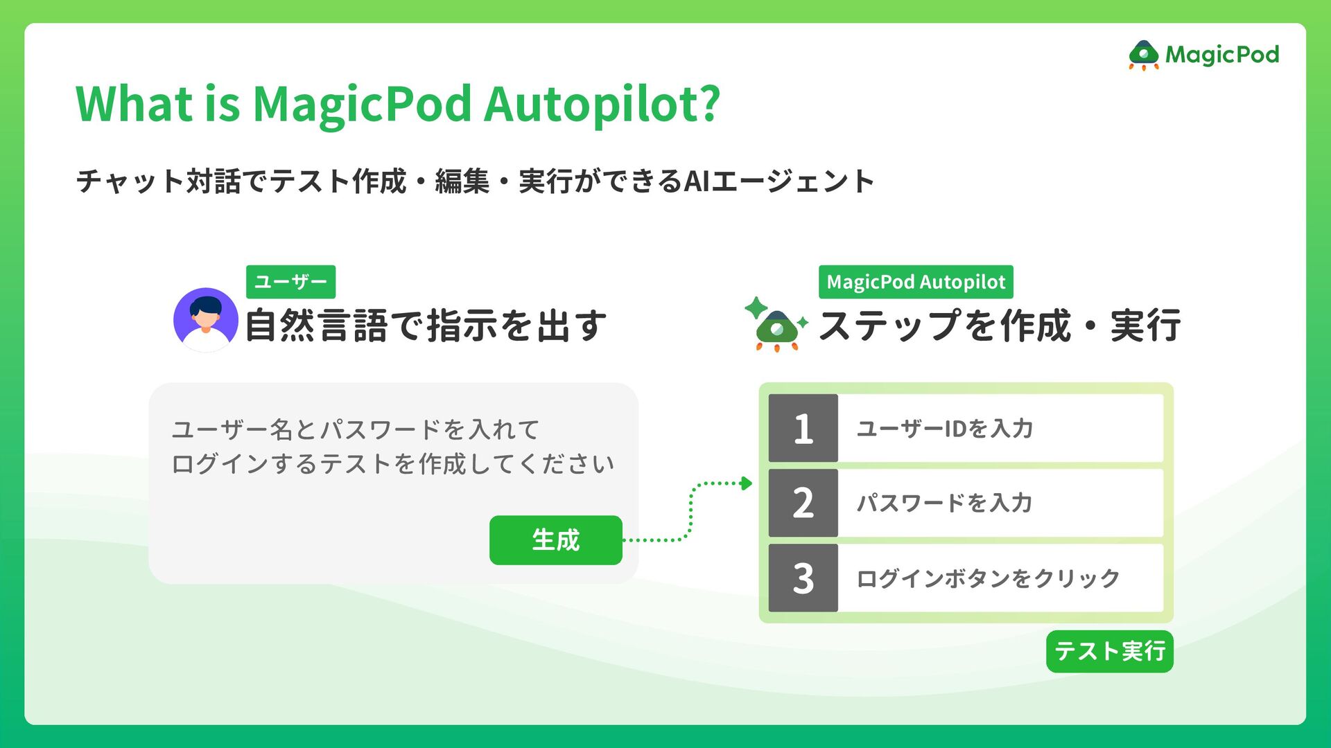 MagicPod Autopilot ユーザーIDを入力 パスワードを入力 ログインボタンをクリック What is MagicPod Autopilot? チャット対話でテスト作成・編集・実行ができるAIエージェント