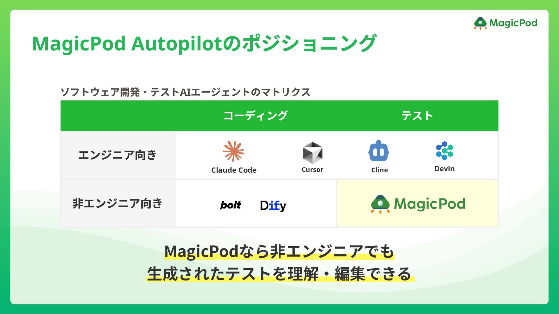 MagicPod Autopilot のポジショニング コーディング テスト エンジニア向き 非エンジニア向き Claude Code Cursor