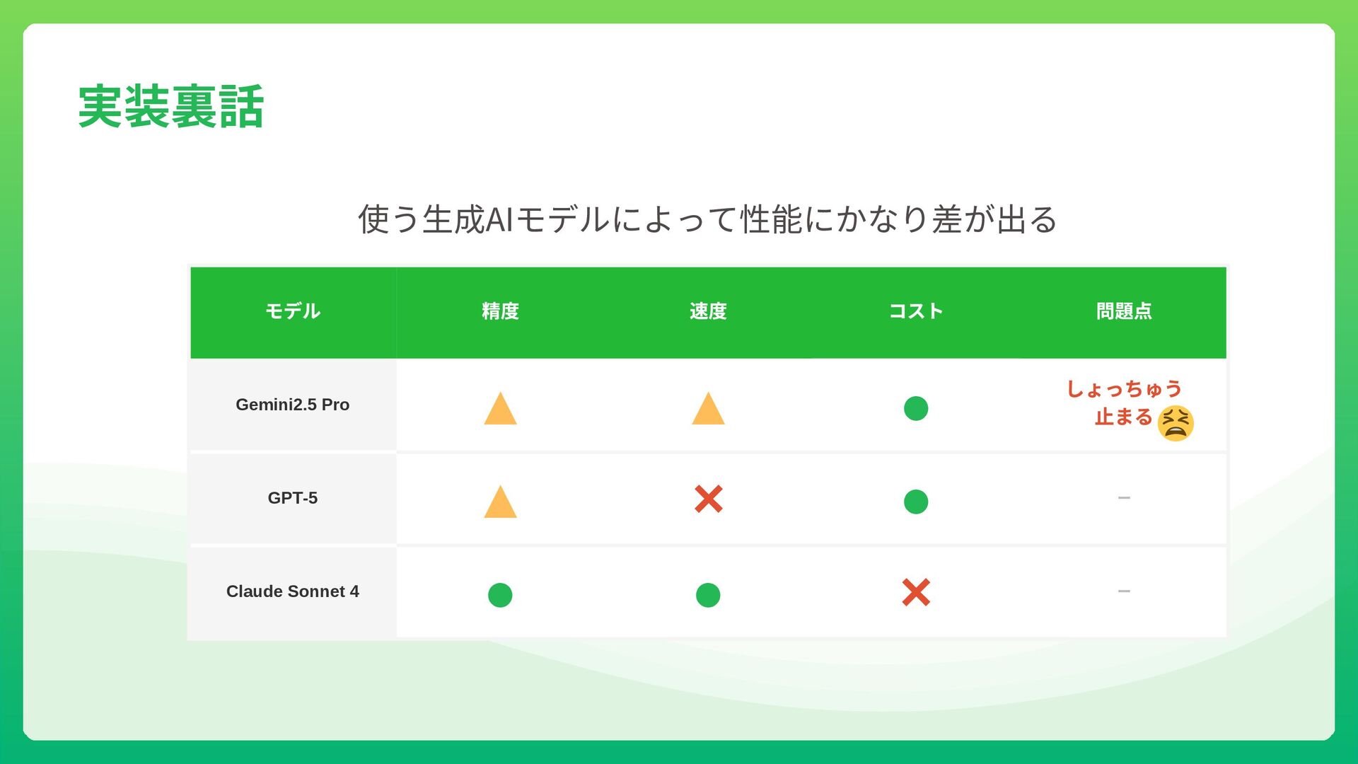 ▲ ▲ • しょっちゅう 止まる GPT-5 ▲ × • ー Claude Sonnet 4 • • × ー 使う生成AIモデルによって性能にかなり差が出る 実装裏話