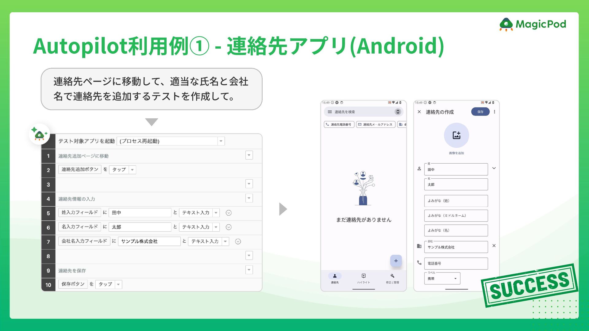 連絡先ページに移動して、適当な氏名と会社 名で連絡先を追加するテストを作成して。 Autopilot利用例① - 連絡先アプリ(Android)