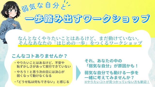 なぜ、私のやる気が〝3日で消える″のか 今回のワークショップでは 「やりたい」に向かう時の「弱気な自分」を 確認するのがポイント