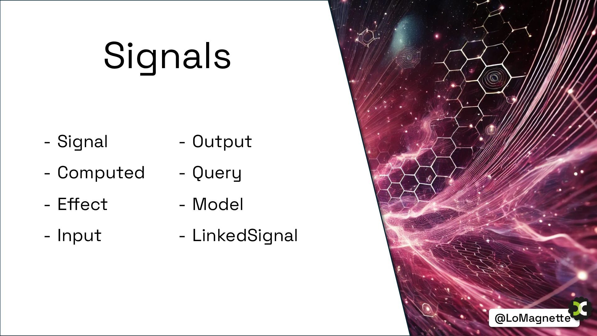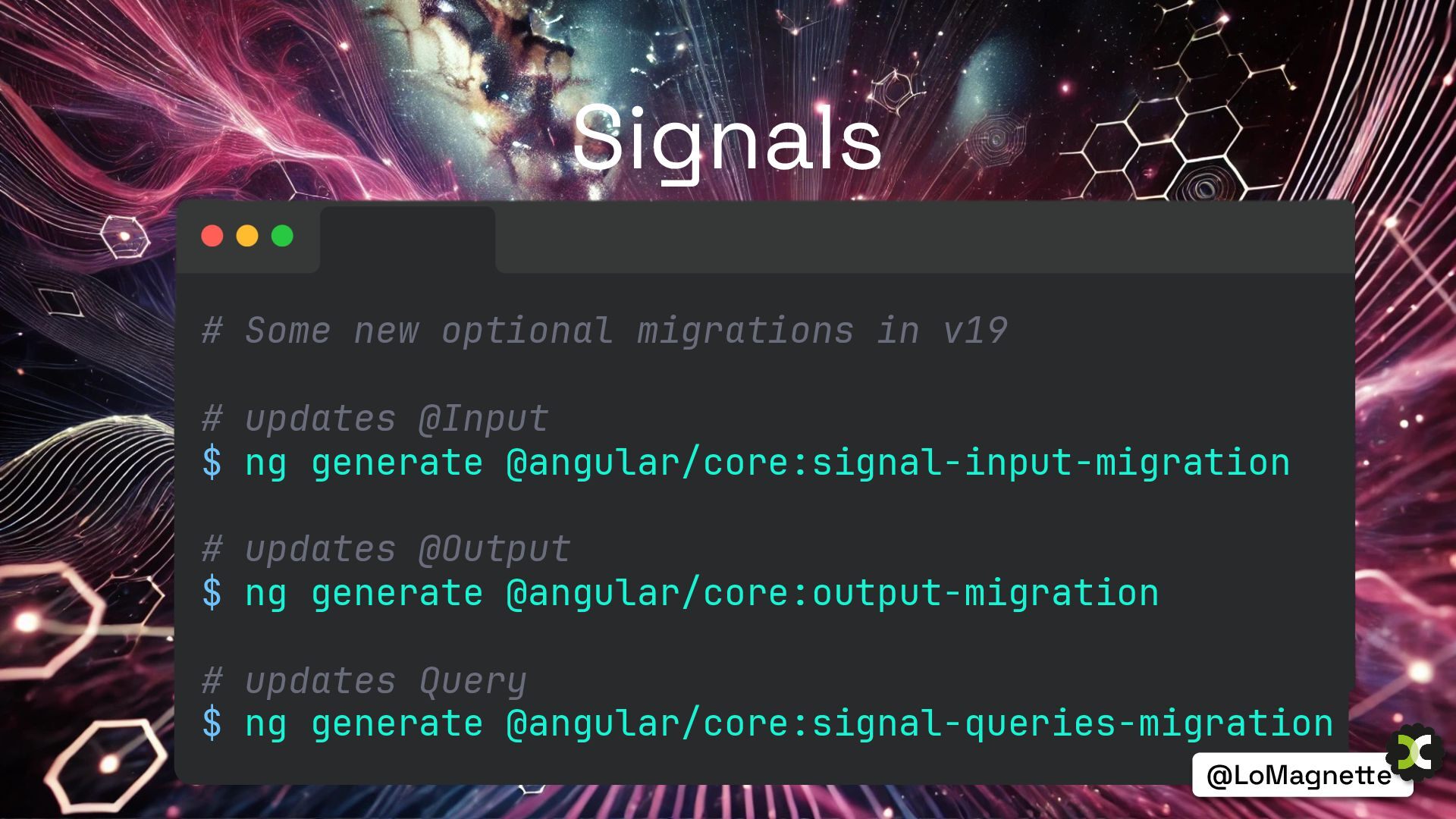 $ ng generate @angular/core:signal-input-migration # updates @Output $ ng generate @angular/core:output-migration # updates Query $ ng generate @angular/core:signal-queries-migration Signals @LoMagnette