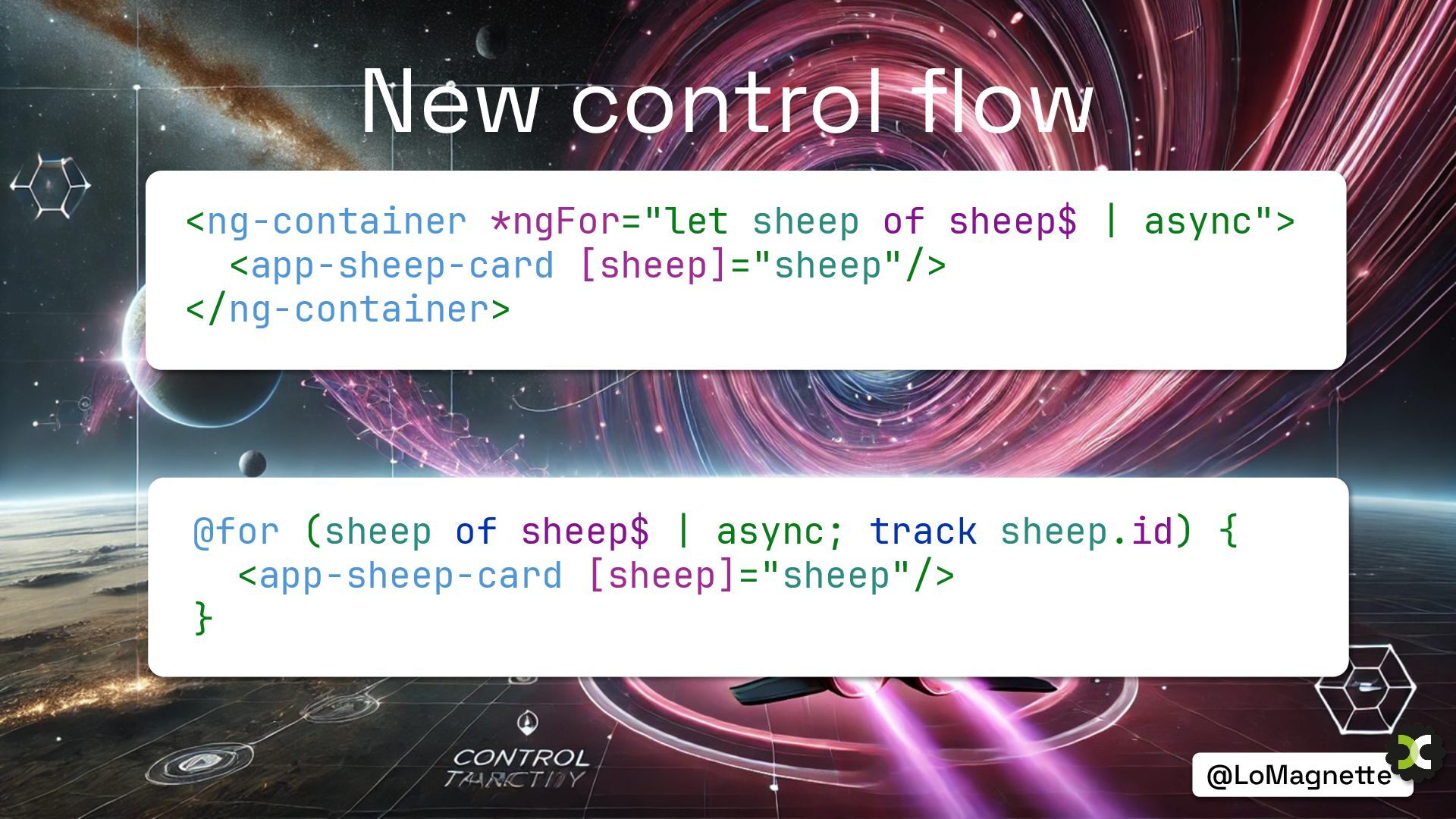 </ng-container> New control flow @for (sheep of sheep$ | async; track sheep.id) { <app-sheep-card [sheep]="sheep"/> }