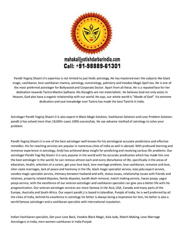 Pandit Yogiraj Shastri is Indian Vashikaran specialist has expertise in Voodoo Black Magic Specialist, Get your Love Back, Love Guru Specialist, Get Back your Love, Love Breakup Solutions, Get Back your Love with Vashikaran, Get back your Lover, Women Love Vashikaran, Love with Vashikaran, Vashikaran Love Guru, Black Magic Guru Ji, Vashikaran Specialist, Vashikaran Baba Ji, Love Guru Tantrik, Black Magic Baba Ji, Kala Jadu Specialist, Women Vashikaran, Girlfriend Vashikaran, Boyfriend Vashikaran, Tantrik Baba Ji, Vashikaran Love Guru Ji, Astrology Solutions, Tantrik Expert Guru Ji, Black Magic Kala Jadu, Jyotish Specialist, Tantra Mantra Baba Ji, Vashikaran Specialist Guru Ji, Havan Pandit, Yagya Pooja Pandit, Kudli Dosh Solutions Expert, Match Making Specialist, Love Marriage Specialist, Indian Vashikaran Baba Ji, Horoscope Specialist, Kundli Dosh Solutions, Family Disputes Solutions, Love Sex Children Solutions, Vashikaran Expert, Higher Study Solutions, Tension Anxiety Solutions, Love Marriage Solutions, Business Loss Solutions, Foreign Visa Solutions, Illness Medical Problem Solutions, Kala Jadu Vashikaran, Property Disputes Solutions, Lottery Number Solutions, Get Your Love Back Mantra, Top Best Astrologers in Ludhiana, Amritsar, Jalandhar, Patiala, Bathinda, Ajitgarh, Hoshiarpur, Batala, Pathankot, Moga, Abohar, Khanna, Phagwwara, Muktsar, Barnala, Rajpura, Firozpur, Kapurthala, mandi gobindgarh, fatehgarh sahib, samrala, jagraon, mansa, sirhind, chandigarh, Mohali, panchkula, kharar, Punjab, Delhi, Haryana, Gurgaon, Utter Pradesh, Bihar, India, Canada, USA, Australia, UK, New Zealand, France, Norway, France, Nepal https://www.mahakalijyotishdarbarindia.com contact numbers +91-9888961301 [email protected]