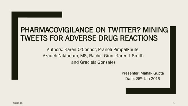 Karen O’Connor, Pranoti Pimpalkhute, Azadeh Nikfarjam, MS, Rachel Ginn, Karen L Smith and Graciela Gonzalez Presenter: Mahak Gupta Date: 26th Jan 2016 16.02.16 1