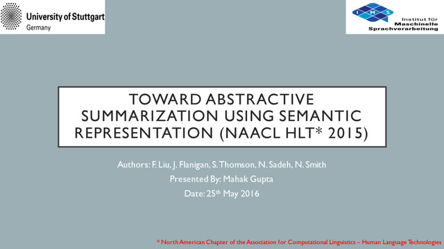 F. Liu, J. Flanigan, S. Thomson, N. Sadeh, N. Smith Presented By: Mahak Gupta Date: 25th May 2016 * North American Chapter of the Association for Computational Linguistics – Human Language Technologies